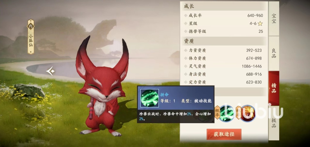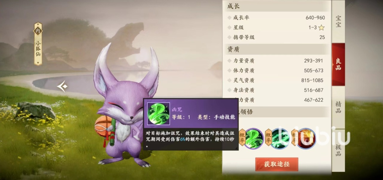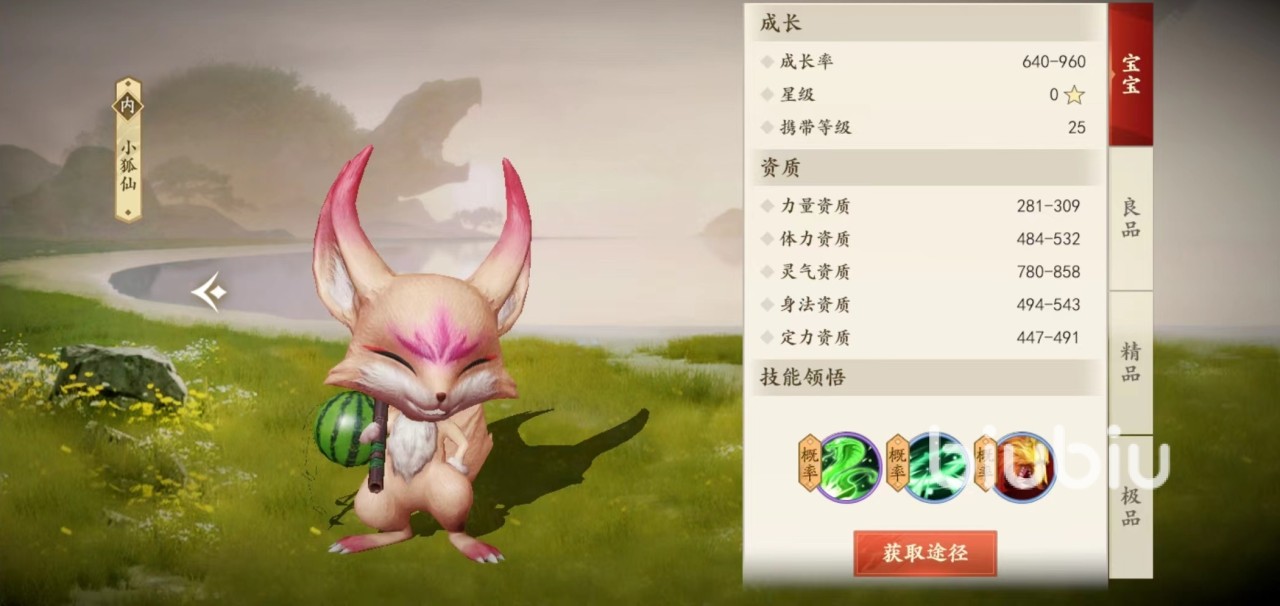 小狐仙从形象方面深受玩家欢迎,自身本体是一名非常可爱的小狐狸,而且挑着大西瓜,达到极品程度时外形变成了黑灰色,挑着的也不再是西瓜而是一盏灯。虽然没有其他特效,但是萌萌外观也赢得了不少玩家喜爱。作为25级就可以携带的宝宝,自然在资质方面不会太高,作为内攻型宠物灵气资质达到1447~1927,已经是比较可观的了,前期完全可以使用,后期再进行更换。