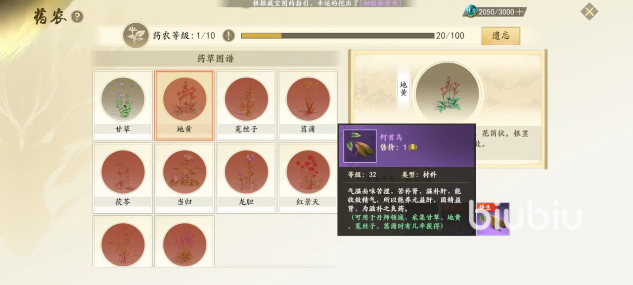 点击学习药农之后,就能够看到有当前药草图谱,每一种图谱都对应着不同地图和需要等级。例如刚刚学习等级只有一级,只能去大理采集甘草,在采集时候还会有伴生产品出现,有蓝色和紫色两种品质。采集药材不同,伴生出现产品也有着很大区别,例如采集甘草伴生的是山茱萸和何首乌,而采集红景天伴生的就是川贝和人参。这些都能在图谱中清楚看到,根据需要去不同地图采集。