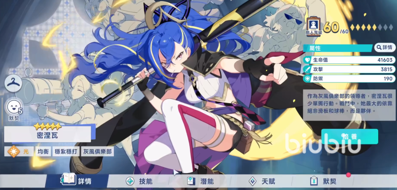 密涅瓦作为灰风俱乐部的领袖,外表看似不良少女,实则内心善良。她是光属性输出角色,以单体高爆发著称,技能带有连续打击与光属性克制效果,尤其擅长对抗暗属性敌人。战斗中,她挥舞蓝牙棒攻击周围敌人,虽攻击速度较慢,但伤害可观。升级技能后,光属性伤害进一步提升。她的“圣爆心连打”可对目标进行多段递增打击;“幻彩星”能强化自身攻击力与穿透能力;“光属性连弹”则对残血敌人造成致命一击,目标血量越低伤害越高,是挑战暗属性怪物关卡的首选角色。