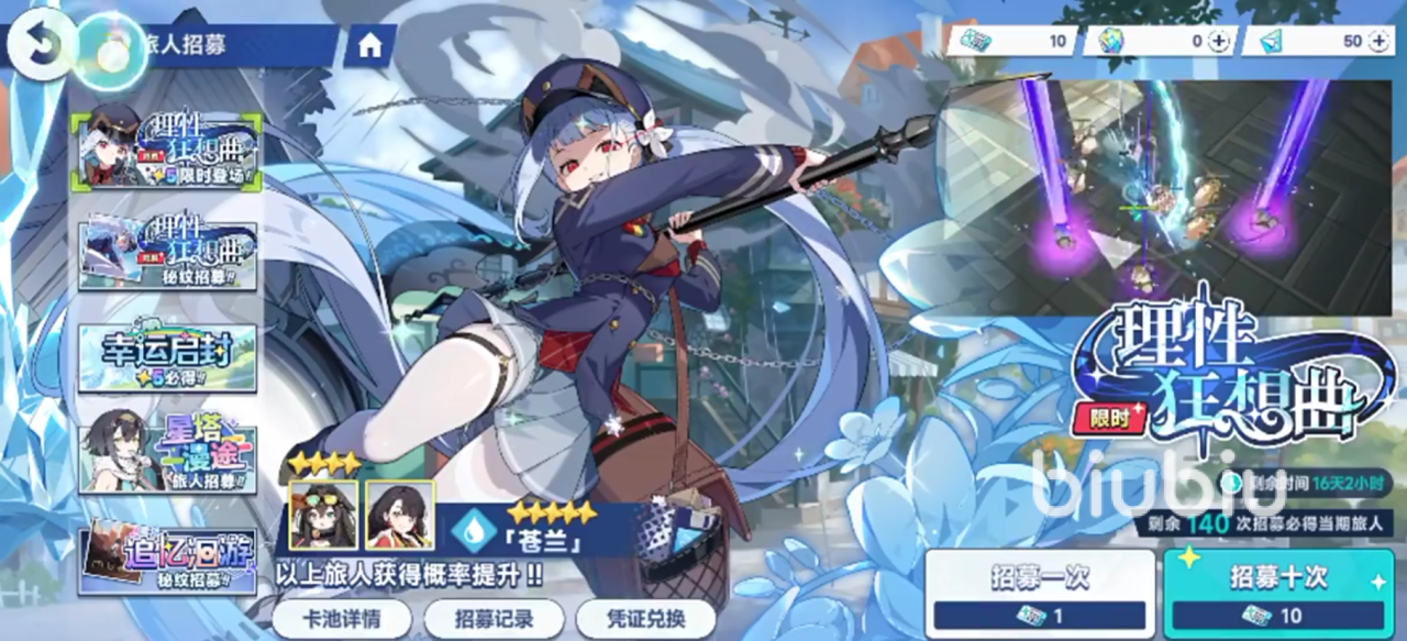 有了资源后点击招募,能看到各种卡池,这些卡池目前主要分为两种类型,分别是限定池和常驻池,限定卡池结束后,当期的UP旅人不会立刻加入到常驻池中,在角色池抽卡都会赠送秘纹池抽卡券。