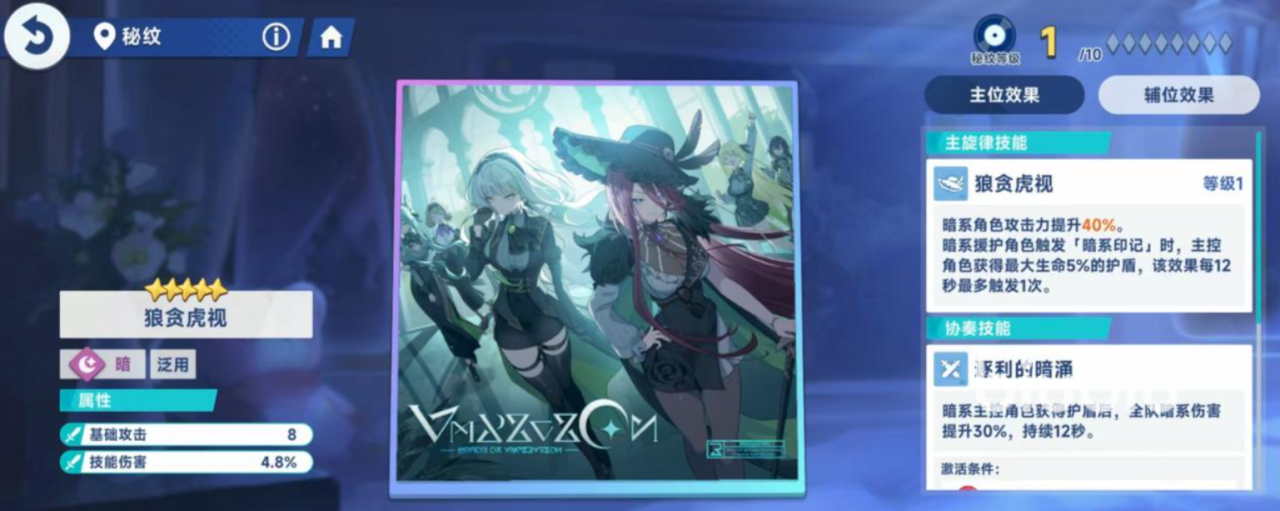 然后是关键的秘纹,秘纹是关键角色能力的提升,不同角色的核心秘纹效果各不相同,大家需要根据角色的定位和战斗策略来进行选择和升级,一般角色分别需要三个主位秘纹,和三个辅位,当我们在探索过程中可通过获取音符的方式,来激活协奏技。