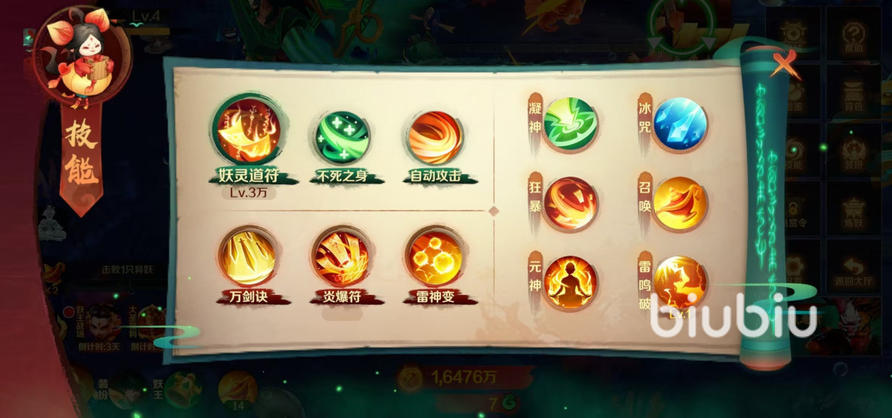 大家在战斗的过程中也要注意一些技巧,首先是技能搭配,在面对数量众多的群体怪物时,选择一些范围伤害高的群攻技能,在面对boss时,就改为控制和单体高伤害技能。灵活运用闪避技巧躲避敌人的攻击,在敌人攻击落空的瞬间抓住机会进行反击。道符升级主要是通过挂机战斗、完成任务和活动等方式来获得经验,提升道符等级后便于击杀更强大的敌人。最后是要积极参与炼妖玩法,击败大妖数量达标后可以进行炼妖,有机会刷新奖池,获得大量妖灵奖励。