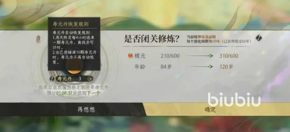 此时会触发闭关,恢复精元并刷新世界的资源,不过要注意演化后角色年龄会上升,年龄一旦超过目前上限就无法进行,此时我们一定要记得用寿元丹来提升寿元的上限。