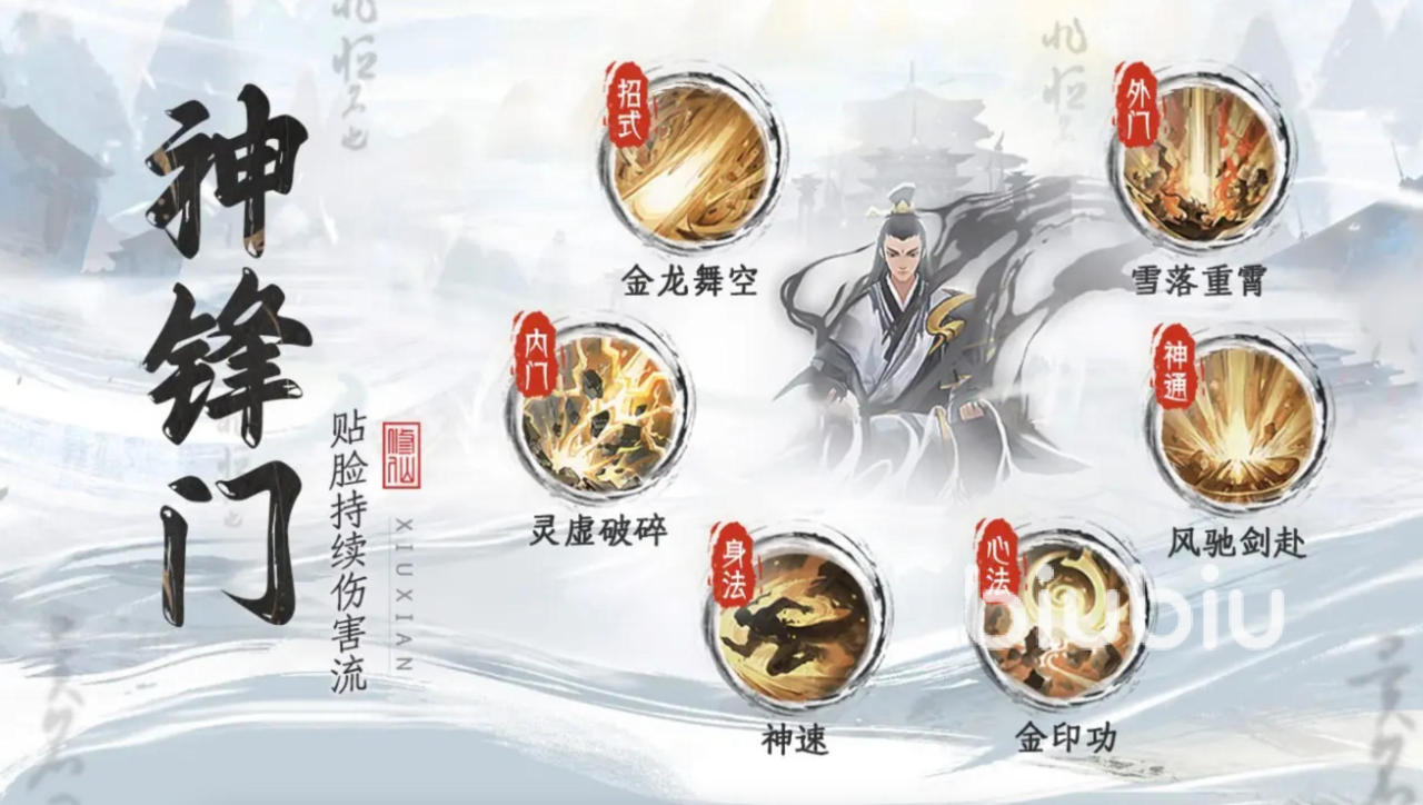 先来看看神锋门的功法。外门功法【雪落重霄】,化身成剑对敌人造成伤害,并对敌人造成洞察;内门功法【灵虚破阵】,突进一段距离,瞬间拉近和敌人的距离;身法【神速】,直接闪进敌人的身边;招式【金龙舞空】召唤金龙,金龙会对近身的敌人造成持续伤害并给敌人附加洞察;神通【风驰剑赴】,消耗所有洞察,对敌人造成海量伤害;心法【金印功】,可以配合雪落重霄使用,使敌人陷入眩晕。