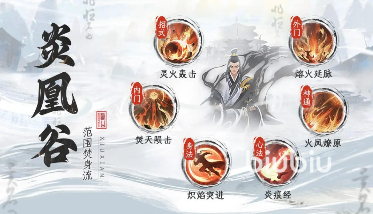 炎凰谷宗门的战斗体系是通过叠加焚身效果和引爆焚身伤害。外门功法:【熔火延脉】造成持续伤害并且会给敌人叠加焚身的效果;内门功法:【焚天陨击】从天而降火陨石,对敌人造成毁灭性的打击,被击中的敌人如果同时带有焚身效果会陷入眩晕;招式功法:【灵火轰击】灵火凝聚成火球,对敌人进行轰击,造成伤害的同时对敌人叠加焚身效果;身法功法【炽焰突进】:化身一团火焰向前突进,突进时会同时造成引爆,瞬间能打很高的爆发伤害;神通功法:【火凤燎原】召唤一只火凤凰,对大范围的敌人造成焚身伤害;心法功法【炎痕经】:提升自身的会心率和会心伤害,增加神通功法的梵天伤害。