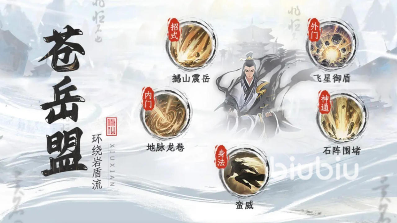 苍岳盟的功法意护盾、控制和近战输出为核心。外门飞星御盾,在自身环绕岩盾,给自身提高护盾的同时,还能对岩盾范围内的敌人造成伤害;内门地脉龙卷对附近的敌人造成伤害,并给自己生成护盾;招式撼山震岳对敌人进行连续多段的攻击;身法蛮威击飞敌人同时生成护盾;神通石阵围堵,生成一个石阵对敌人造成范围伤害,同时封锁敌人行动。