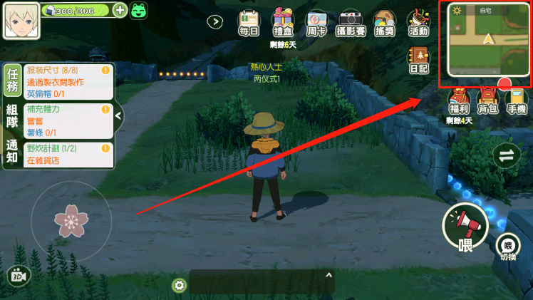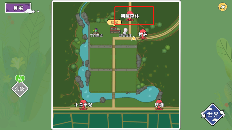 2、不知道如何进入的玩家可以先回到自己的“自家”中,然后打开右上角位置的“小地图”,在大地图的上方位置是“朝晖森林”,玩家点击即可自动寻路达到。