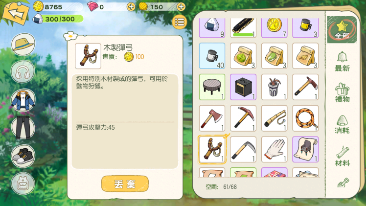 1、弹弓:弹弓是用来打猎的必备道具,弹弓分为低级弹弓、中级弹弓、高级弹弓,高级弹弓的攻击力最高,同时效率也是最高的。由于每使用一次就会消耗一次体力,由于土拨鼠是低级猎物,使用最普通的低级弹弓就好。