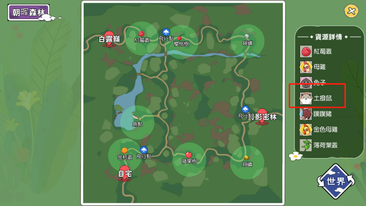 1、朝晖森林是游戏的初始区域,这里主要产出游戏中的一级木材、水果、渔场、动物等资源。