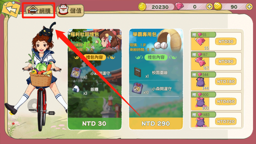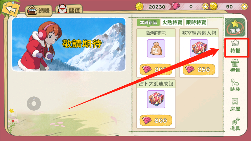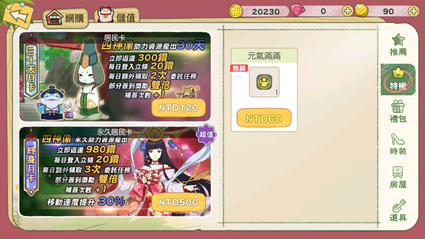 (2)进入充值界面后点击左上角位置的“网购”按钮,在网购界面的最右边一栏有个“特权”按钮,居民月卡和永久居民卡就在这里出售。居民月卡售价是120新台币,永久居民卡售价是500新台币,大家可以按照自己的需求购买。