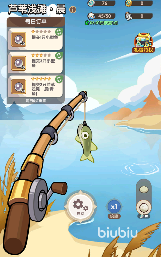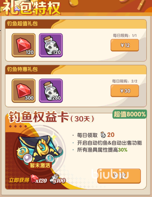 获取到的鱼可以批量出售出去兑换成金鱼币或者是银鱼币,等级越高,出售价格也就越贵。获取到的金鱼币和银鱼币有很大用处,可以去商店兑换成相应奖励。还有一个特权大家要注意关注,那就是钓鱼权益卡,开启之后每天可以领取钻石和牛奶瓶体力,还开放自动钓鱼和自动出售的功能。并且对渔具属性也有提升,有更高几率出现稀有鱼。