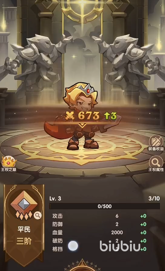 然后就是角色自身的战力提升,这个是完全可以放心使用材料的,因为这个可以直接提升本体的战斗力以及血量,而且中后期而且随着等级的提升,玩家们还可以突破新的段位,最初期的段位是平民,后续可以不断晋升高级的骑士以及王国等段位哦,能获得额外的权限以及能力。