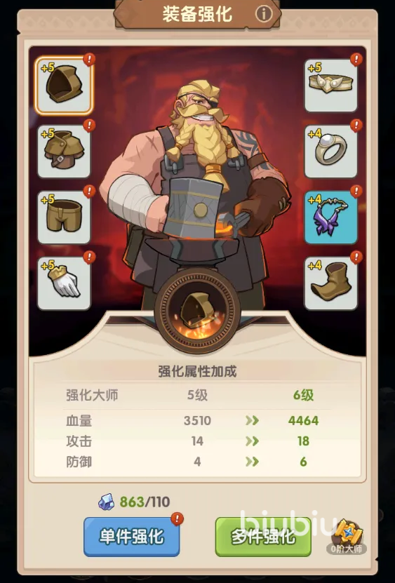 先来说一下早期解锁的装备系统。在军团战斗里面推关或者开启万宝箱就会掉落装备,而推到魔女森林之后就能解锁装备强化功能,而强化则需要消耗装备结晶。通关的地图越多,掉落的后期装备品质就会越高级,而替换装备的时候,系统会问你是否自动分解最低等级的装备得到结晶。