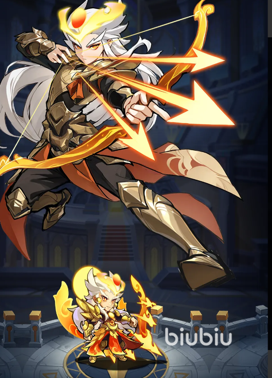 灼夷被世人成为神箭手,他的主动技“落日弓矢”会拉开落日弓,发射出箭矢对目标范围内所有敌人造成三次火系伤害,他的“金乌坠空”会将箭矢发射向天空,释放被封印的若干金乌飞向目标,对范围内敌人打出5次火系伤。