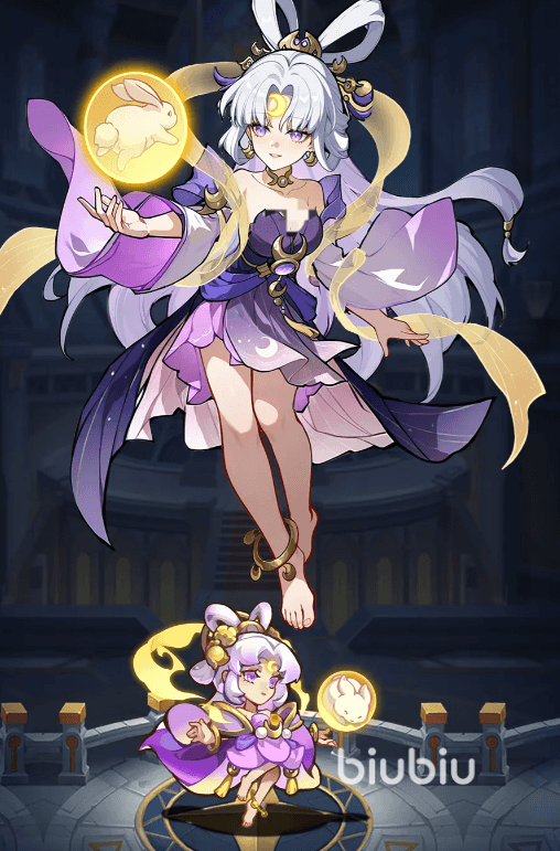 月姮是来自异世界的仙子,容貌清丽、身姿轻盈,她的主动技“兔起”会让玉兔苏醒,释放出灵识跳跃向敌人,携带月风将目标范围内全部敌人包围,并造成两次风系伤害,她的“素月流光”会召唤出玉轮笼罩敌人,扬起携带桂花的旋风,对范围内全部敌人打出4次风系伤。