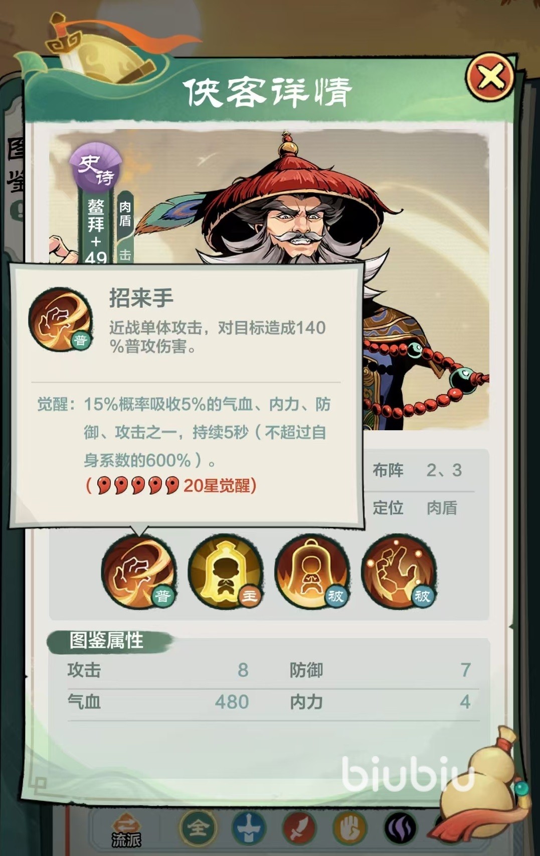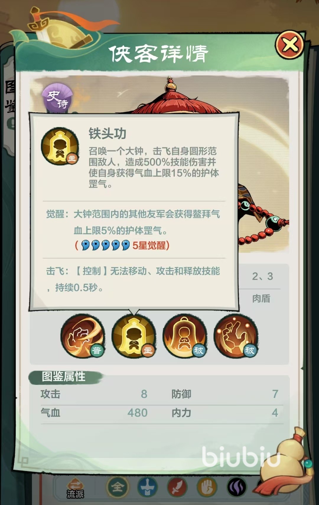 鳌拜是属于肉盾类型的侠客,他的普攻技能属于近战单体伤害,能够对目标造成140%普攻伤害,觉醒之后有15%概率,吸收5%气血、内力、防御、攻击这4项属性之一,持续5秒钟。主要技能铁头功,召唤出一个大钟,将自身圆形范围内的敌人击飞,造成500%技能伤害,并使自身获得15%血量上限的护体罡气。在觉醒之后,大钟范围内的其他友军也会获得鳌拜15%血量上限的护体罡气。