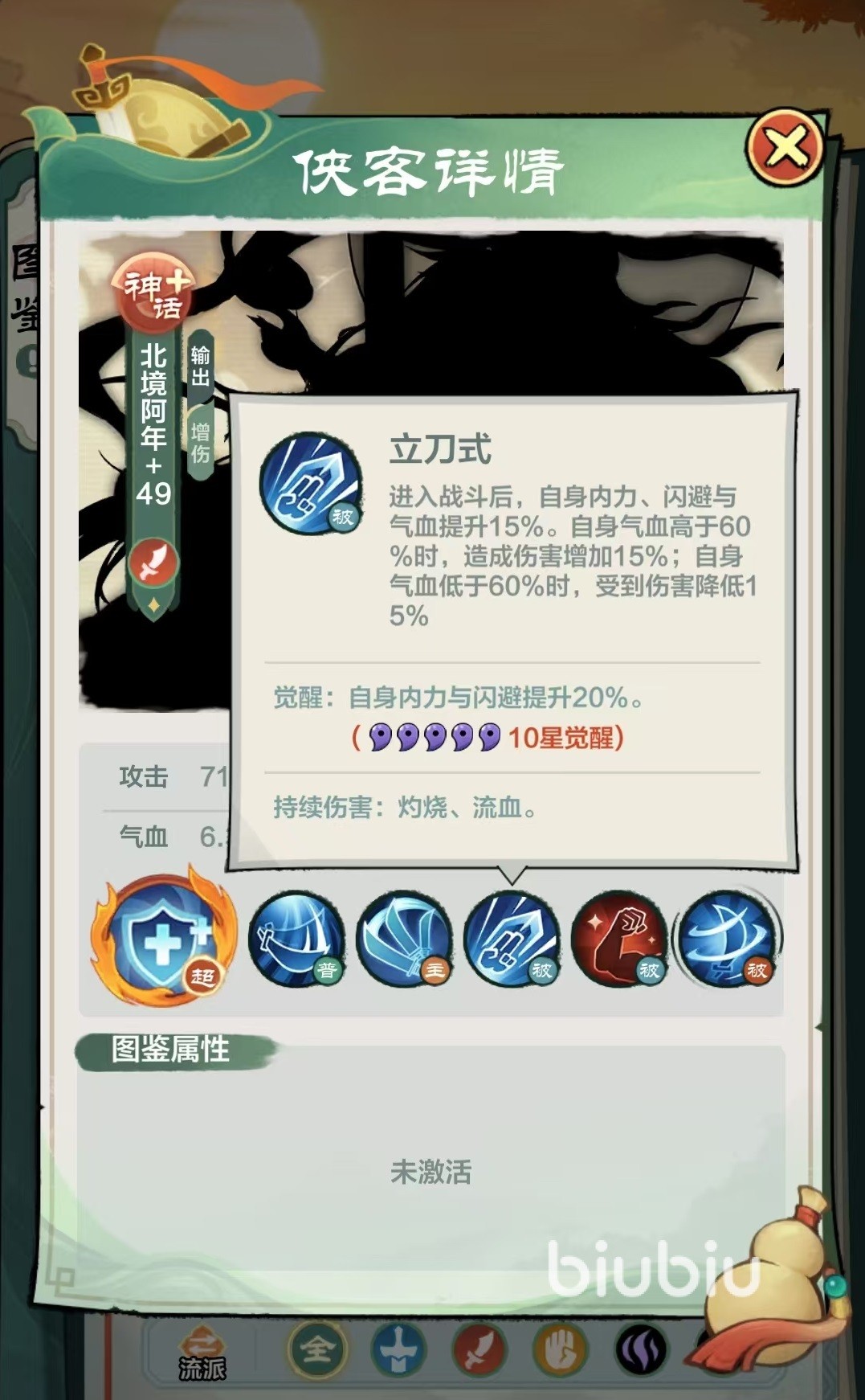 主要技能迅刀斩,以自身为圆心,对周围圆形范围内区域造成4次300%技能伤害,每次都会移除目标一层持续伤害效果,并按照对方当前血量百分比附加额外伤害。主动技能造成的持续伤害移除,同样也可以触发凉州血术效果,这样自身将会持续获得治疗。作为神话英雄,他拥有三个被动技能,第1个立刀式,进入战斗后自身内力、闪避与气血提升15%,当自身血量高于60%的时候,造成伤害增加15%,当自身血量低于60%的时候,受到伤害降低15%。这一被动效果就是高血量的时候伤害提升,低血量的时候受到的伤害降低,可攻可受,不愧是神话级别的伙伴。