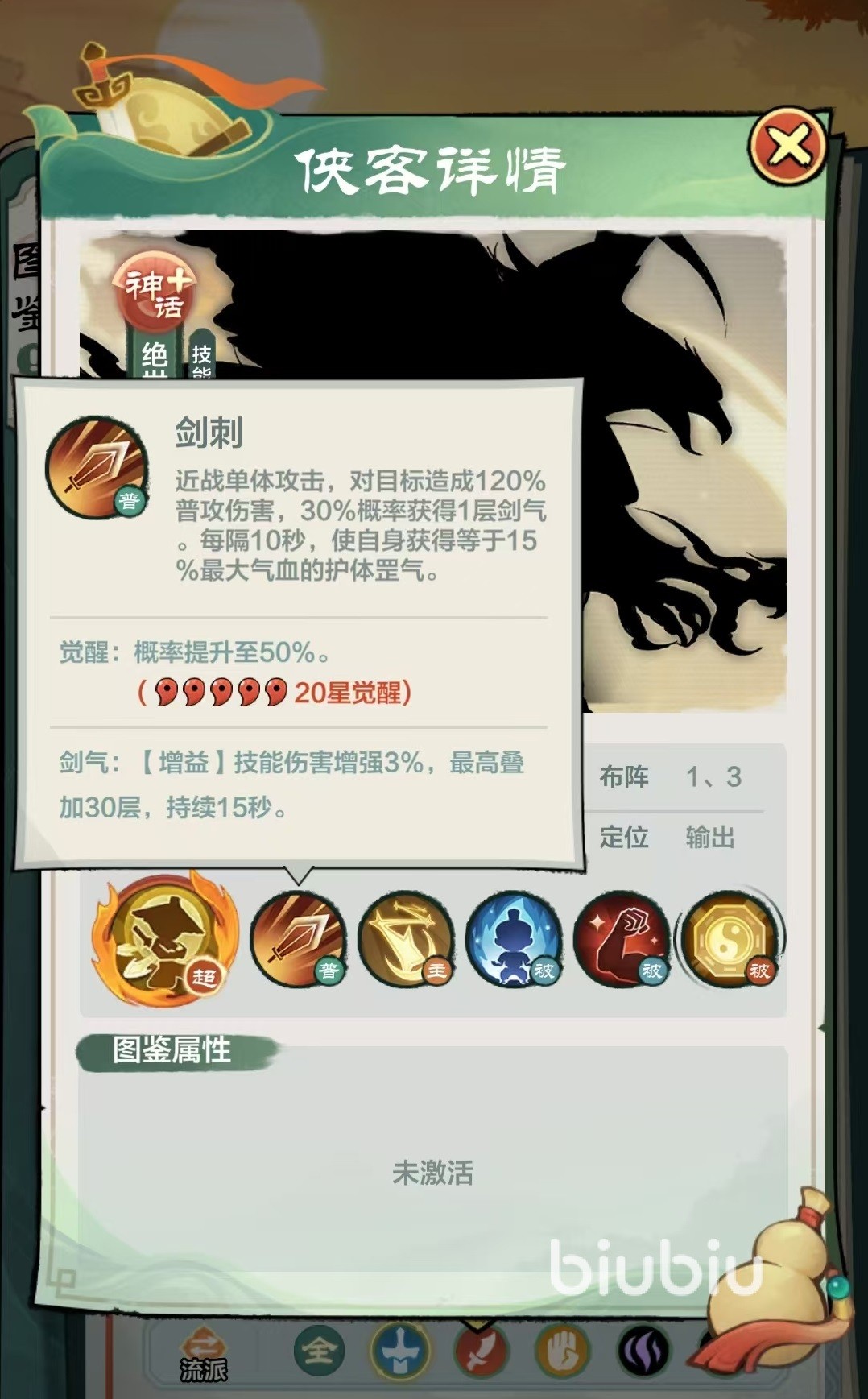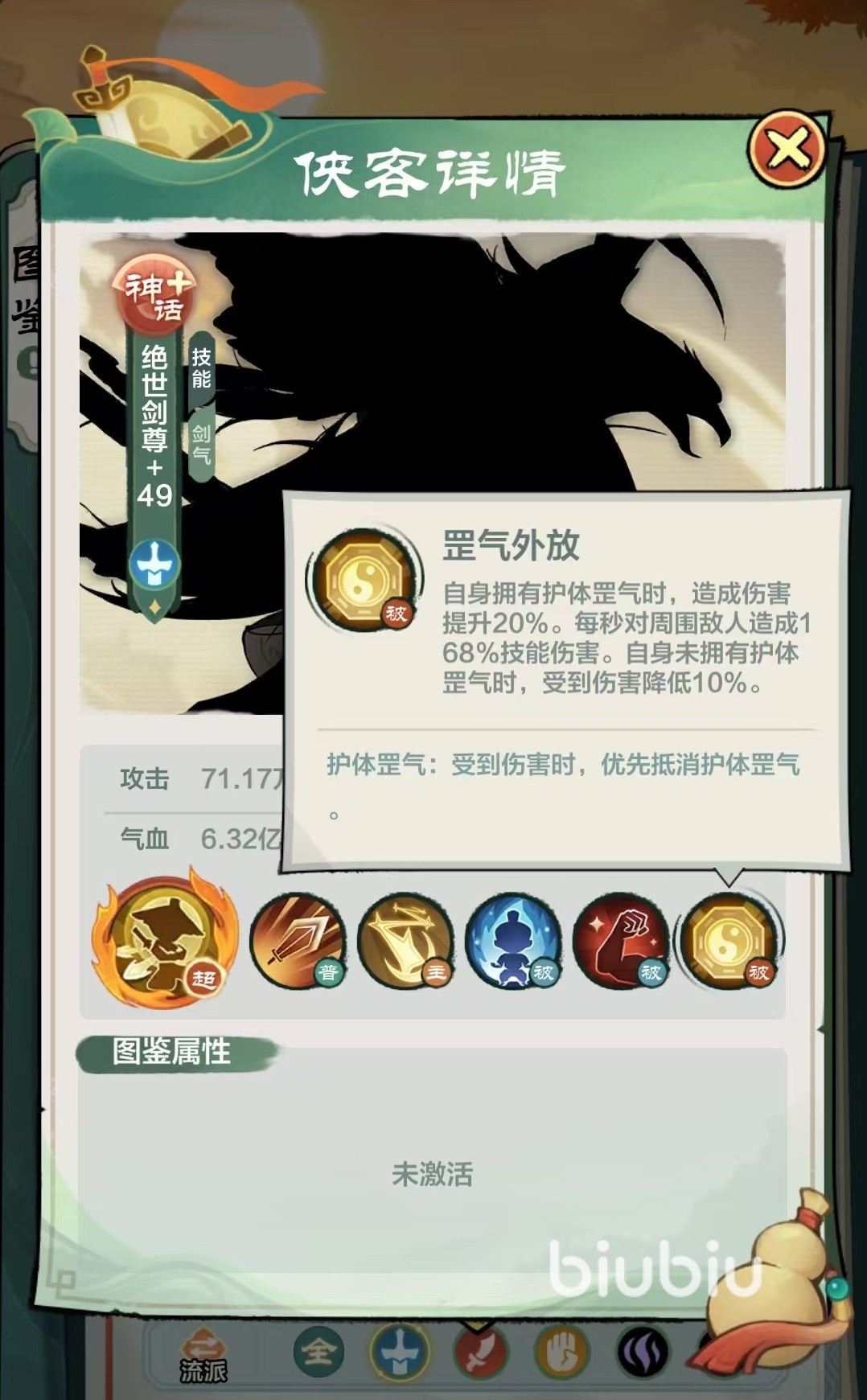 最后一个被动罡气外放,当自身拥有护体罡气时,造成伤害提升20%。每秒对周围敌人造成168%技能伤害。自身如果没有护体罡气时,受到伤害降低10%,在受到伤害时将会优先抵消护体罡气,大家可以理解为护盾。如果大家喜欢使用剑客职业,那么绝世剑尊绝对是最值得培养的一名侠客,它可以布置在阵容的一、三两个位置,属于前排输出类型。
