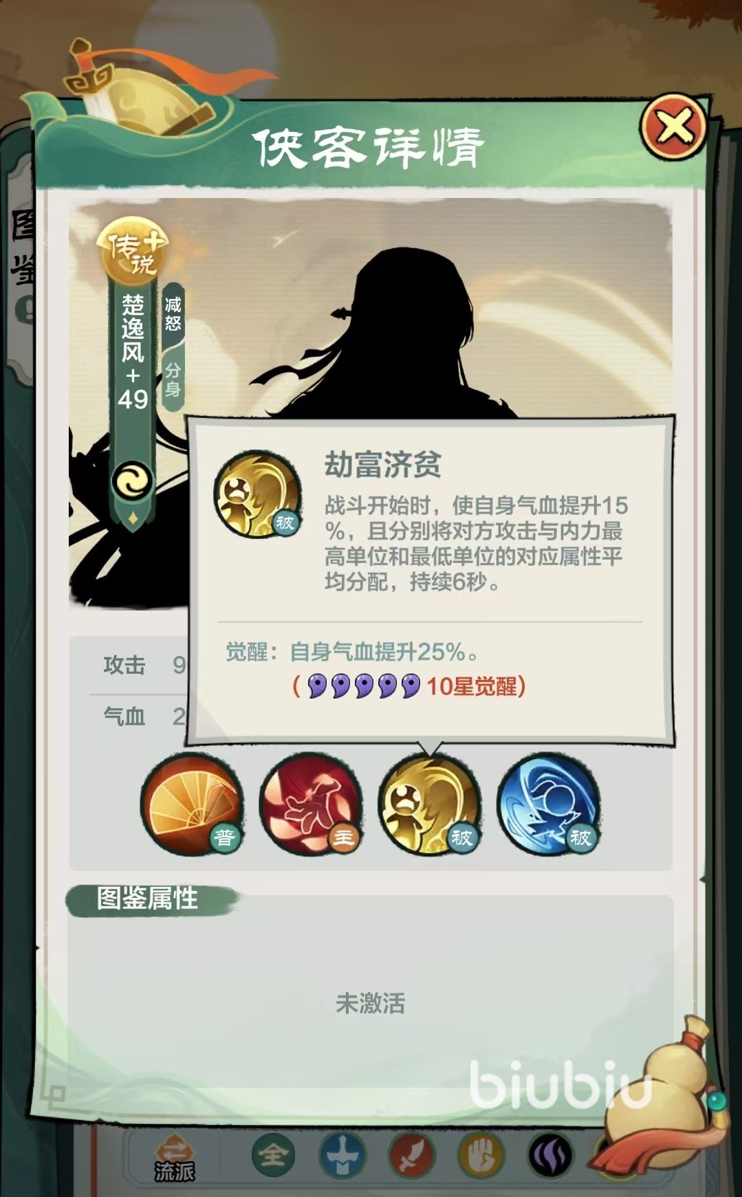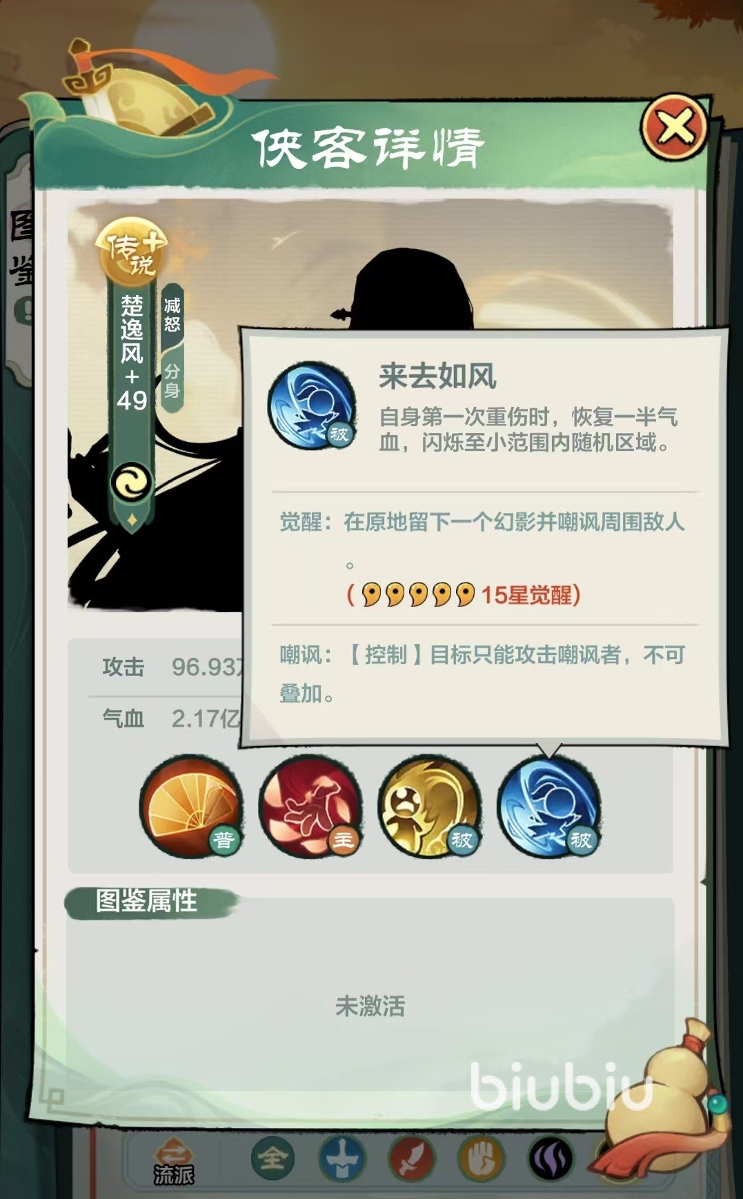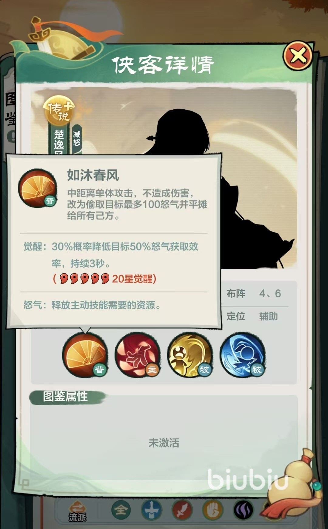 因为楚逸风不是神话角色,所以只具有4个技能。自身的普攻如沐春风,属于中距离单体攻击类型,不造成伤害,但是会抽取目标最多100点怒气,平摊给所有的己方侠客。在觉醒之后百分之三十几率降低目标50%怒气获得效率,持续三秒钟。怒气是释放主动技能所需要的资源,削弱了对方怒气,提升了我方怒气,在战斗中是很有用的属性,对方没有怒气,自然就无法释放技能。