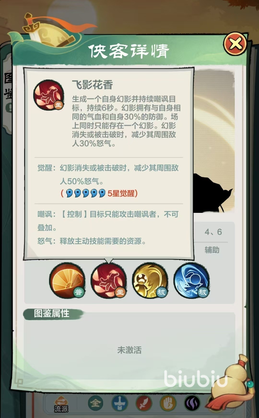 主动技能飞影花香,生成一个自身幻影持续嘲讽目标,持续6秒钟,幻影拥有和自身相同的血量以及自身30%的防御,场上最多只能存在一个幻影。当幻影消失或被击破的时候,减少周围敌人30%怒气,嘲讽目标可以控制嘲讽者主动攻击自身。这样幻影就吸收了对方的伤害,起到保护自身队友的作用,第1个被动劫富济贫,在战斗开始时,提升自身15%血量,分别将对方攻击与内力最高的单位和最低的单位对应属性平均分配,持续6秒钟。这样就相当于将对方攻击输出比较强势的单位进行了限制。