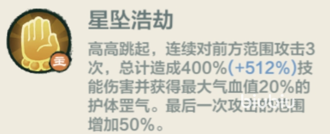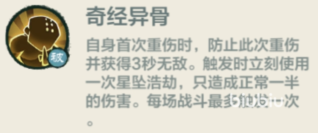 被动技,首次受到重伤时,可以规避掉这次重伤并且获得3秒无敌,同时立刻打出一半伤害的星坠浩劫。这拳师的防反打法的关键技能,残血情况下有着极强的爆发。
