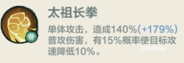 太祖长拳,单体普攻技,可以对敌人造成超高倍率的伤害,并且有一定几率对敌人施加迟缓的负面效果,只要敌人被挂上迟缓控制,拳师就可以在极短的时间内造成更高的换血率,不仅是对boss,竞技场中也是如此,这个技能也可以作为很好的起手技,提升后续技能的命中率效果。这里的换血率是指换血效率,在敌人被施加了迟缓状态后,拳师能以更低的血量损耗来对敌人造成更多的 伤害,输出端就更强势。