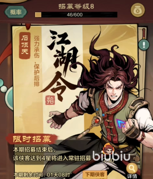 我们一边收集资源一边选出适合自身的侠客。之后等UP卡池出现的时候,我们再利用资源将其给抽取出来。除了主线外,一些日常的任务和擂台我们也是需要做的,前期拿不到好的名次也没关系。因为擂台的活动前期会给予玩家们一定的保底奖励,这些奖励积攒下来是很多的。