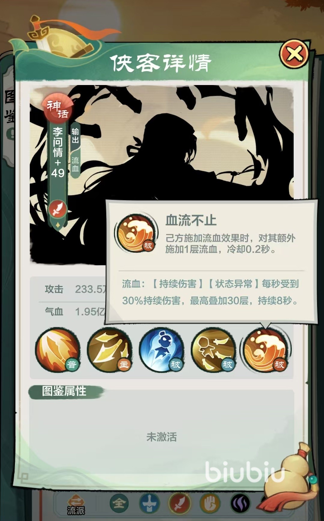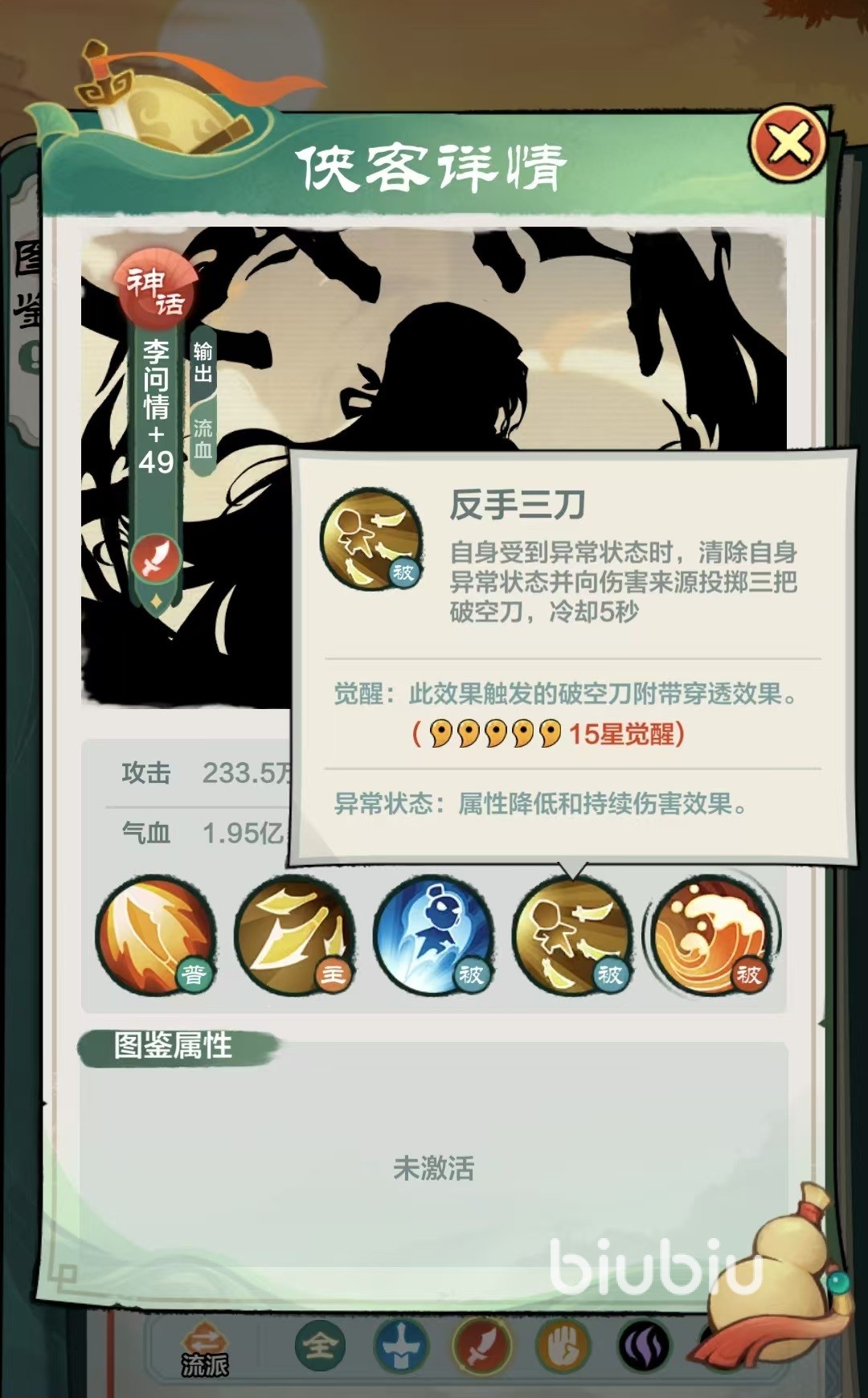 第2个被动反手三刀,自身受到异常状态时会清除自身异常状态,并向伤害来源投掷三把破空刀,冷却5秒钟,觉醒之后,此效果触发破空刀附带穿透效果。有了这样的被动,李问情就很难被异常状态所影响,冷却时间5秒钟并不算长。第3个被动血流不止,己方施加流血效果时,对其额外施加一层流血,冷却0.2秒。从这些主动和被动效果,大家可以看出,李问情主要的输出来源除了自身的主动技能之外,就是流血效果所附加的持续伤害,搭配的时候走的也是持续输出的路线。