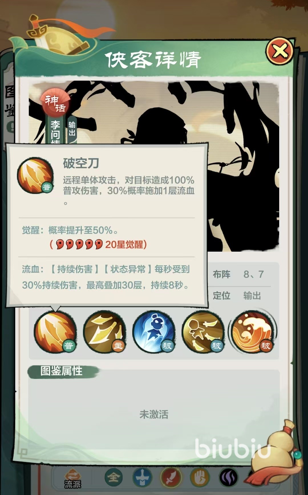 李问情具有一个普攻,一个主动技能和三个被动。先来看一下他的普攻破空刀,属于远程单体攻击类型,对目标造成100%普攻伤害,有30%几率施加一层流血效果,觉醒之后触发的概率提升至50%。流血属于异常状态和持续伤害,每秒钟会受到30%持续伤害,最多能叠加到30层,每一层持续8秒钟。