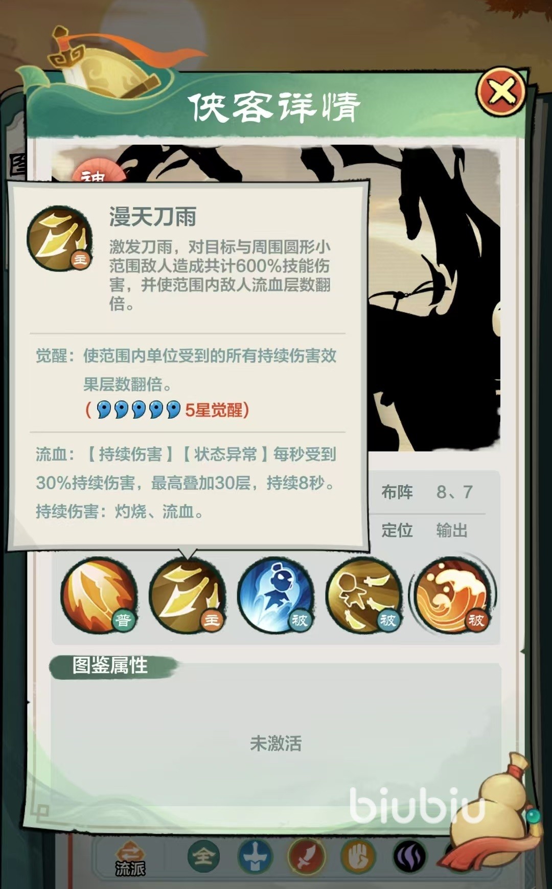 主动技能漫天刀雨,激发刀雨,对目标与周围圆形小范围敌人造成总计600%技能伤害,并使范围内的敌人流血层数翻倍。觉醒之后使范围内单位受到的所有持续伤害效果重复翻倍。这两者区别就在于觉醒之前只能对于流血生效,觉醒之后对其他持续伤害也能生效,例如灼烧等。第1个被动技能迷踪幻步,进入战斗后使自身攻击速度提升15%,觉醒之后额外提升10%自身攻击力。
