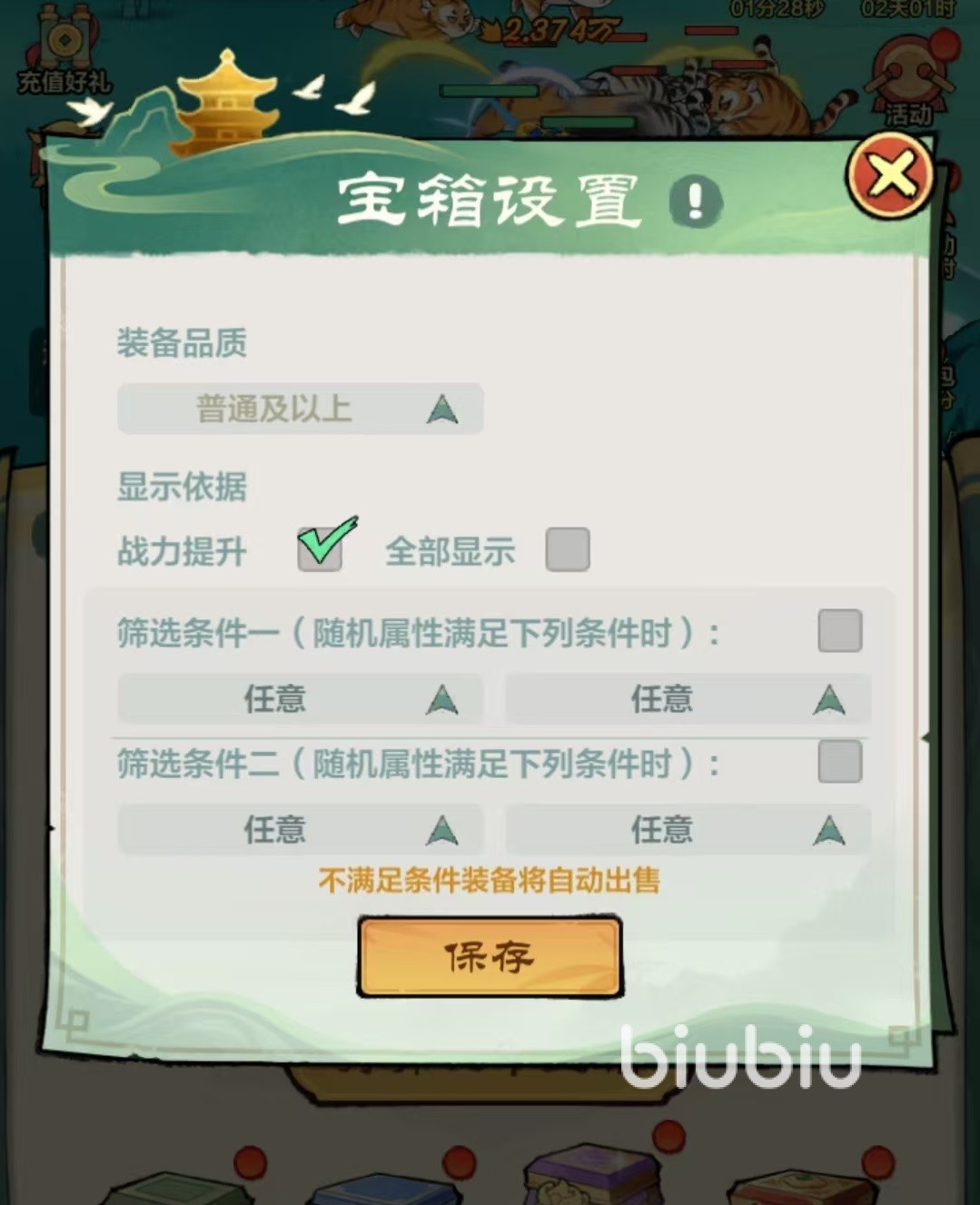 大家可以通过往前推进主线、完成塔爬塔活动,挑战各种副本等来获得装备宝箱,开启之后随机获得不同属性的装备,大家要根据自身的情况,选择是否要留下或者是直接出售出去。因为后续宝箱会越来越多,所以大家在开启之后获取的大量装备,如果不想手动点击,还可以进行一些设置。点击右下角的设置图标,就可以看到有当前宝箱设置功能,可以先对装备品质进行选择。