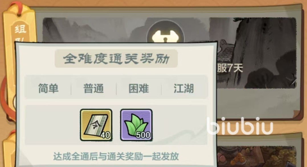 首次通关副本下所有难度,都可以获得额外奖励,奖励随达成全难度通关结算发放。这里小编要重点介绍的是江湖难度,江湖难度副本如果在长期无人通关会逐渐降低难度,直到降到最低。大家首次失败后,可以隔天再次尝试通关,当有玩家成功通关后,难度也会降低至最低,所以大家不用担心难度的问题。