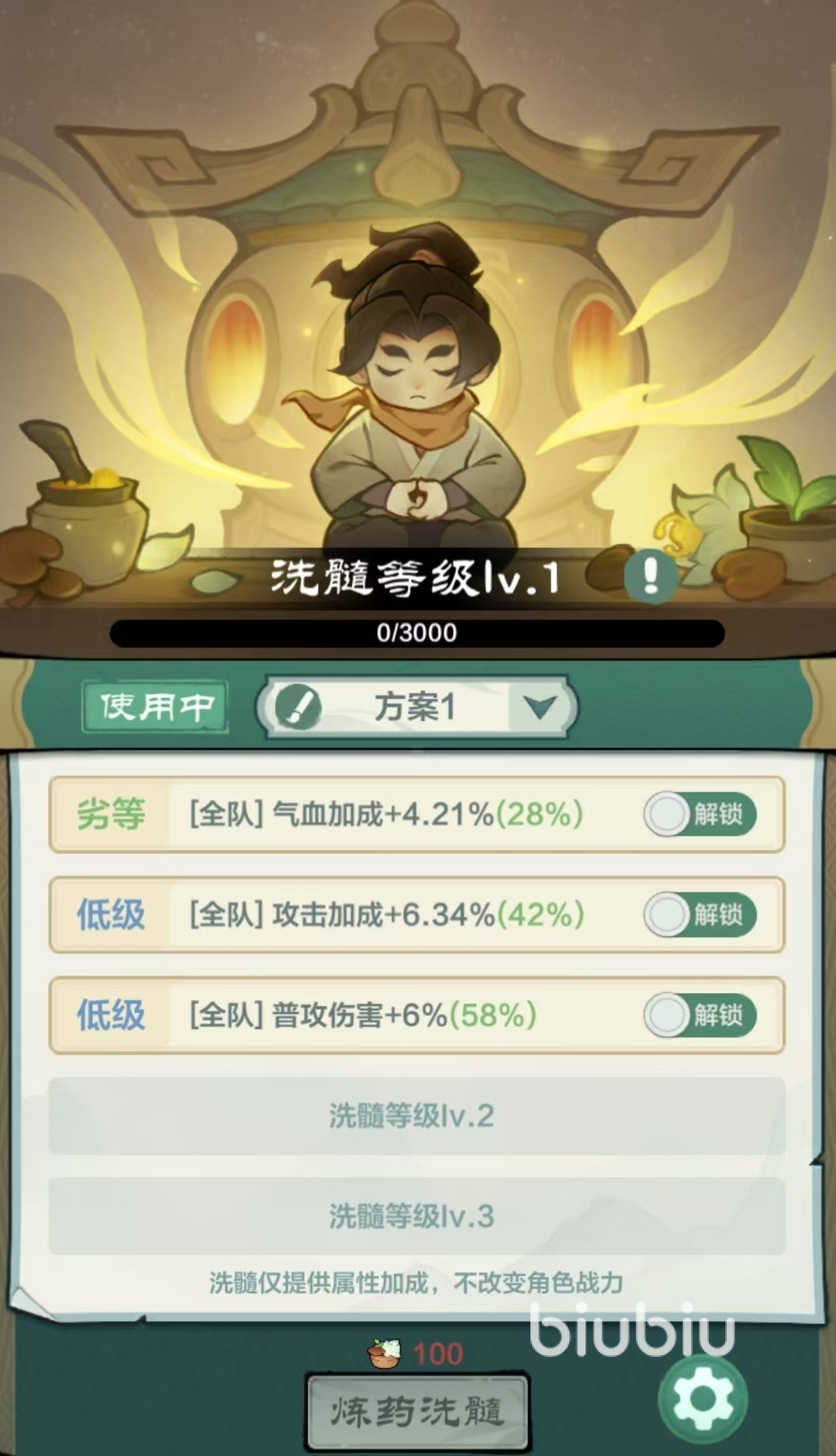 当大家通过不断闯关开启了家园玩法后,就可以看到其中有各种生活玩法设定,炼药洗髓就是其中之一。炼药洗髓效果是提供属性加成,但不改变角色战力。角色有5条属性可以让大家去洗练,通过洗涤等级不断提升,开放的属性条数也会增多。