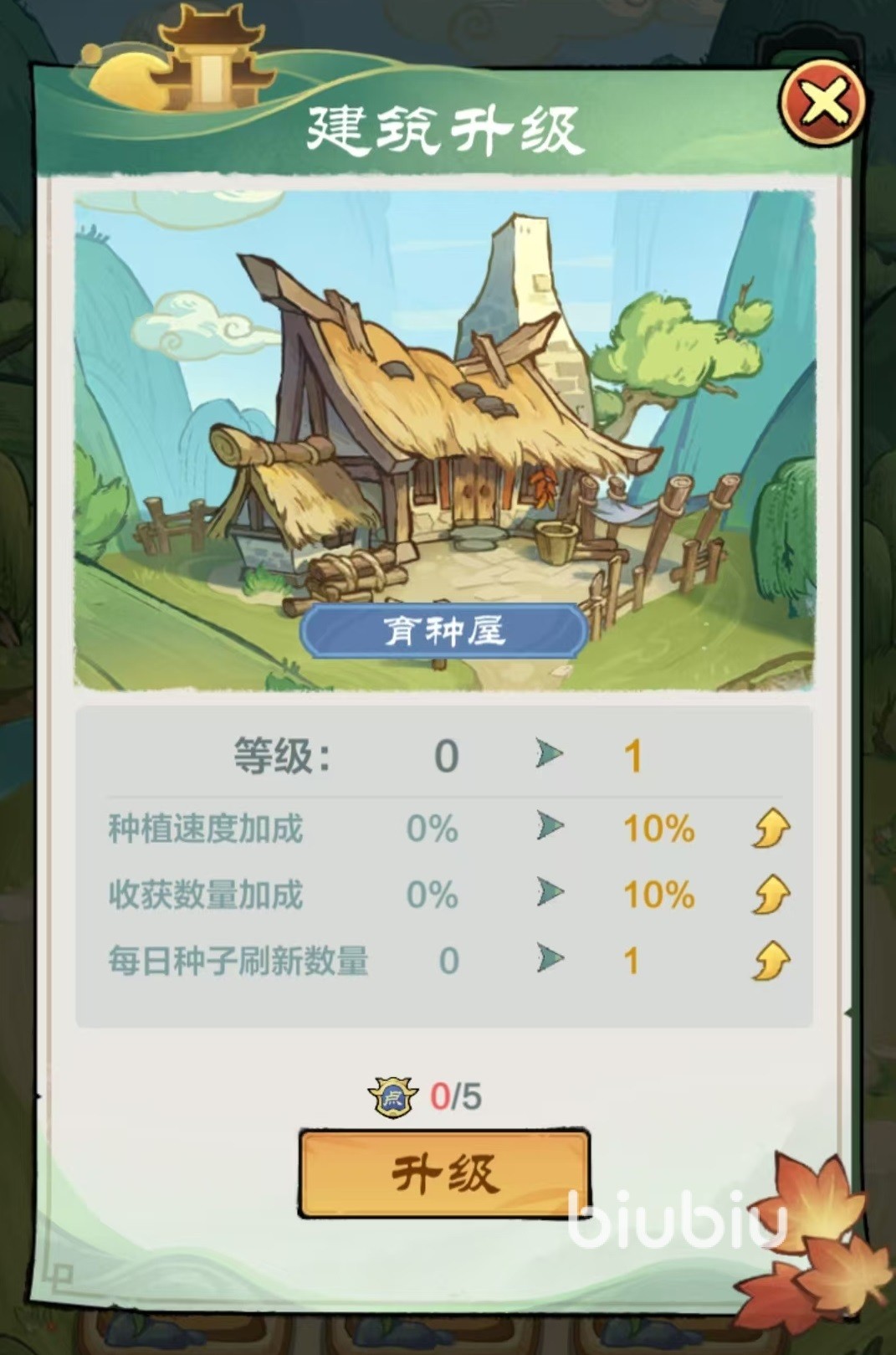 在庄园中除了种田之外,还有相应建筑,包括育种屋、农具、灵泉等。育种屋的作用是用于提升种植速度加成,收获数量加成和每日种子刷新数量。农具能够增加庄园战斗攻击加成,庄园战斗防御加成和种植速度加成。灵泉能够增加庄园战斗攻击加成,庄园战斗防御加成和收获数量加成。这三种建筑的升级都需要消耗建筑点数。目前在庄园中一共开放了6块地,供大家去种植,种植所需要的种子在相应的商店功能购买。庄园商店中除了种子之外还有肥料,通过施肥能够加快种子成长,这样可以尽量多的获得药材。
