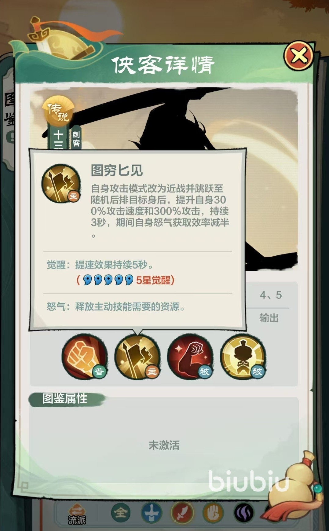 主动技能图穷匕见,自身攻击模式改为近战,并跳跃至随机后排目标身后,提升自身30%攻击速度和300%攻击,持续3秒钟,在此期间自身怒气获取效率减半。觉醒之后攻速加成持续到5秒钟,本来在普攻时候中距离就可以生效,但是主动技能开启后会变为近战,而且跳跃到敌方后排进行输出,是很有效的后排杀手。增加的攻速和攻击力,能够针对对方后排输出或者是辅助进行有效杀伤。
