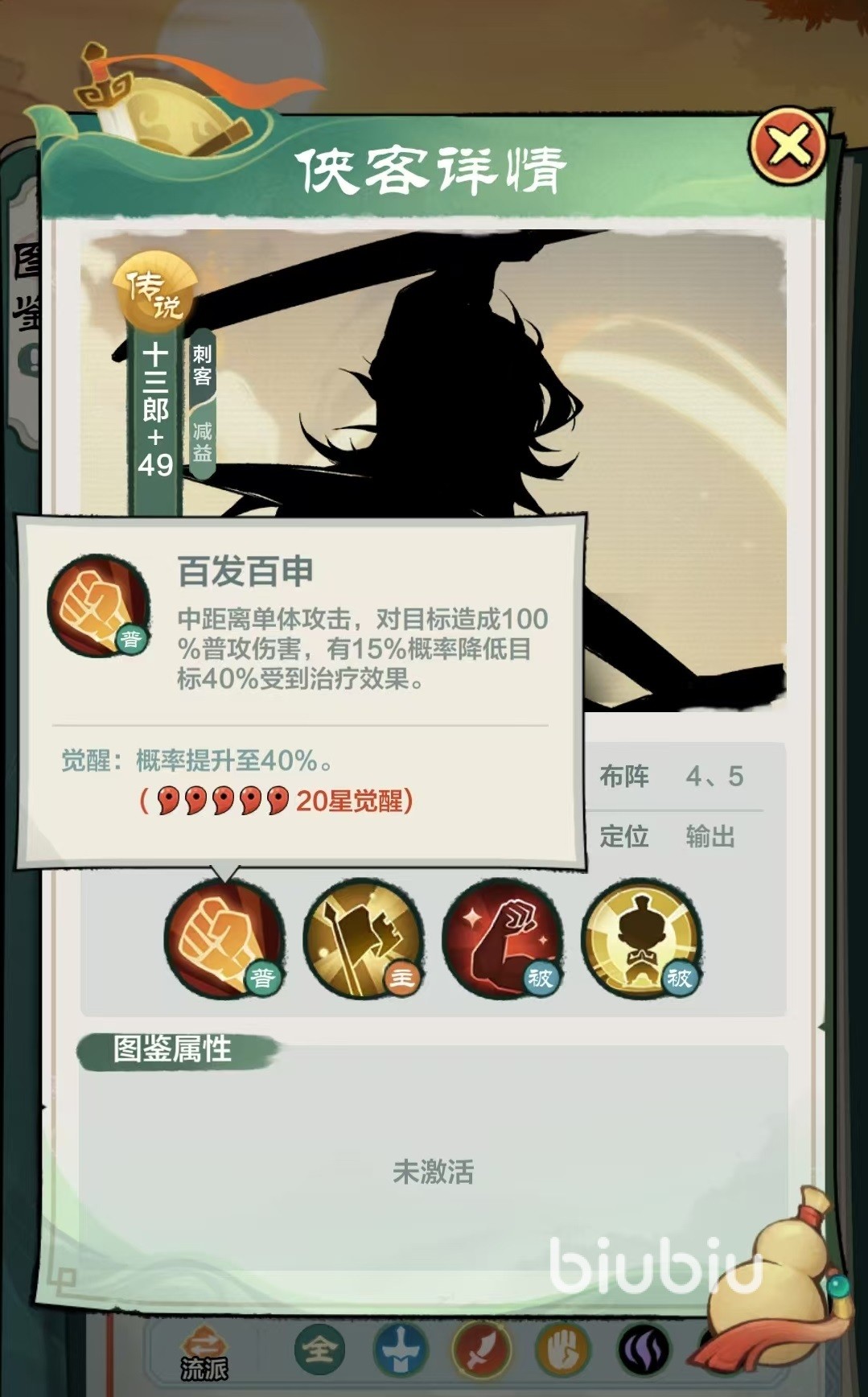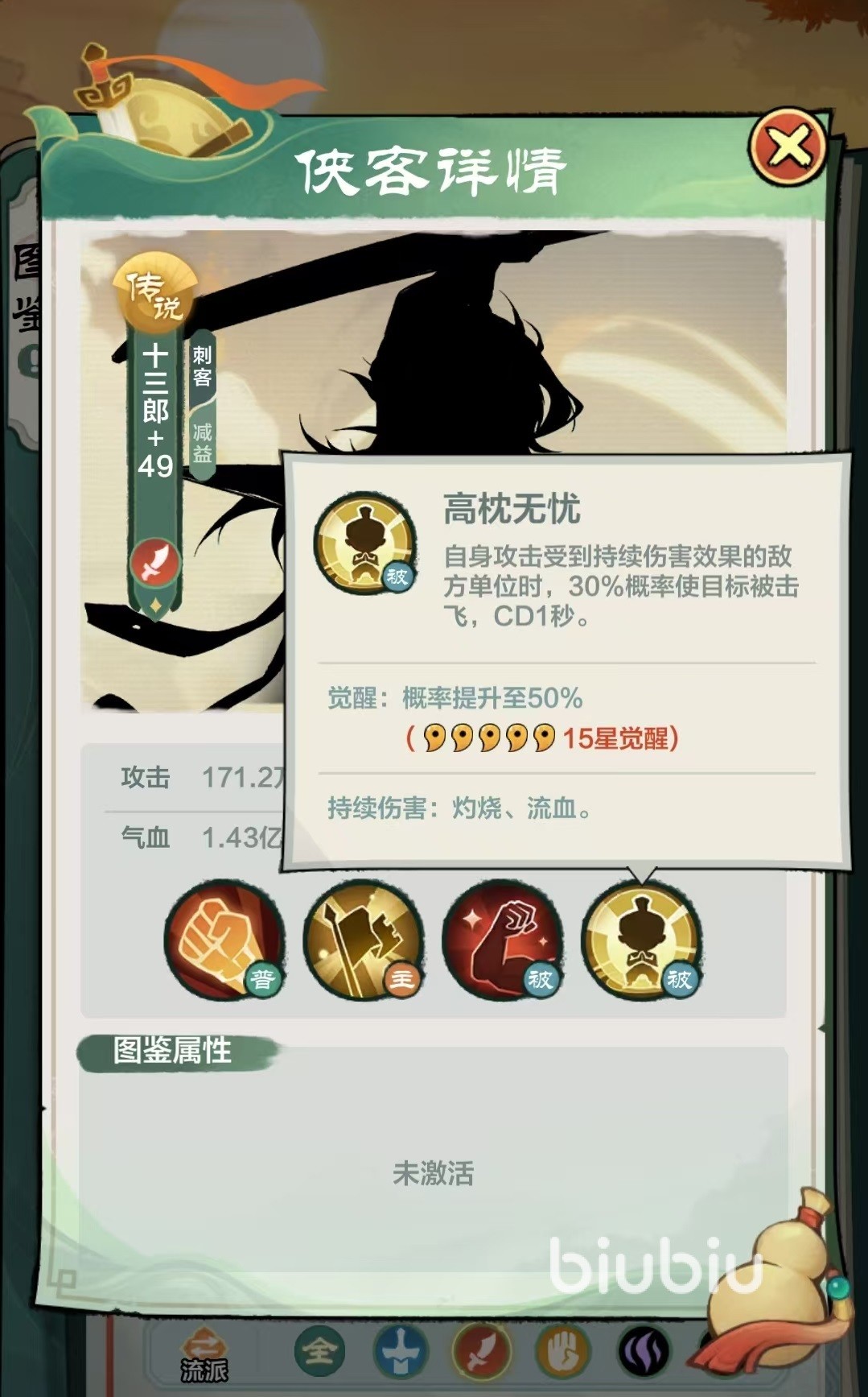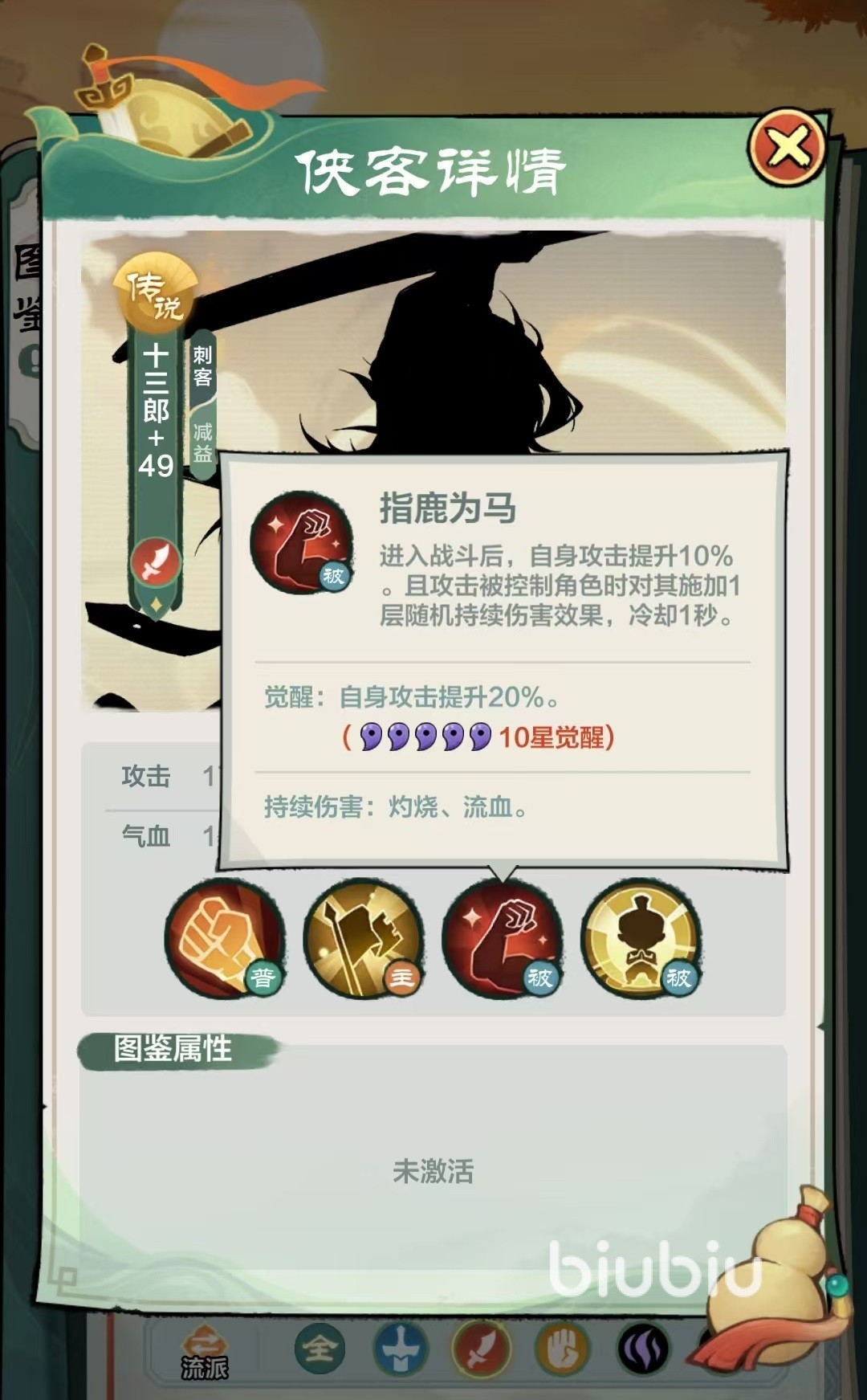 被动技能指鹿为马,进入战斗后自身攻击提升10%。如果被攻击目标正处于控制状态,那么会随着施加随机1层持续伤害效果。觉醒之后自身攻击提升变为20%,持续伤害主要包括灼烧和流血。被动技能高枕无忧,在自身攻击受到持续伤害效果影响的敌方单位时,30%击率使目标被击飞,觉醒之后触发概率变为50%。十三郎是属于刀系侠客,他的这些技能无论是主动还是被动,也比较依赖持续伤害类型,这一点就和自身刀系核心很好地搭配起来,所以也是刀系阵容中的伤害补充。