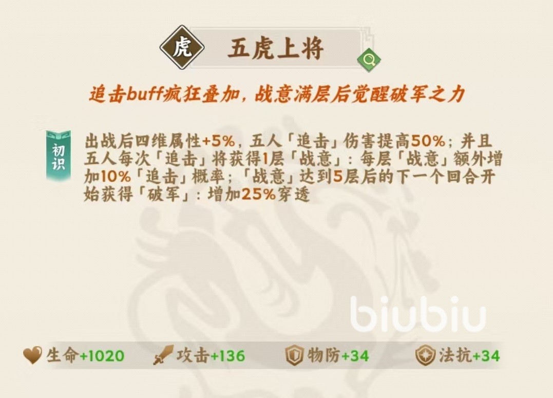 关羽的最佳队友就是五虎将,大幅度提高这5个上阵武将的追击伤害,在触发追击时可额外叠加效果,增加后续追击的概率。这样依靠追击,这5人就可以输出恐怖的伤害。有了这5个作为核心,剩下的武将可以随便选,如果英雄池储备比较深,那么第6人就选择刘备。有了刘备之后就能有六蜀将上阵,10%的攻击和10%的生命加成到手。而且刘备还是很好的辅助武将,能增加续航,剩余位置根据刷新情况随意去选就是了。