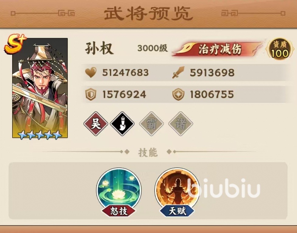 孙权的怒气技能可治疗三个生命比例最低的己方武将,为其恢复大量生命值,后续还有额外治疗效果加成作用,所以孙权是一个比较纯粹的辅助型武将。达到五星时,战斗开始免疫1次控制,孙权受到的主动伤害减少。达到九星时增加同列己方武将的减伤属性。英杰一星时,首次退场可降低击溃自身的敌方攻击力。英杰三星时,己方退场为其恢复生命值,无双时己方退场可为其恢复大量生命值,并增加减伤属性。只要有孙权在场,我方就能避免因为减员而导致的战斗失败,是一个很有保障的武将。