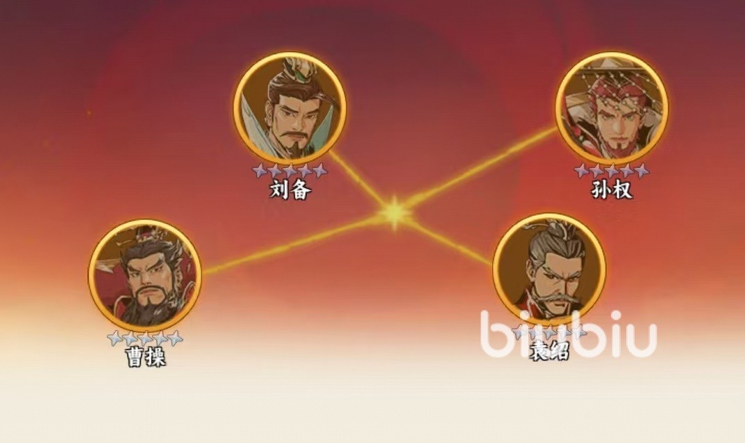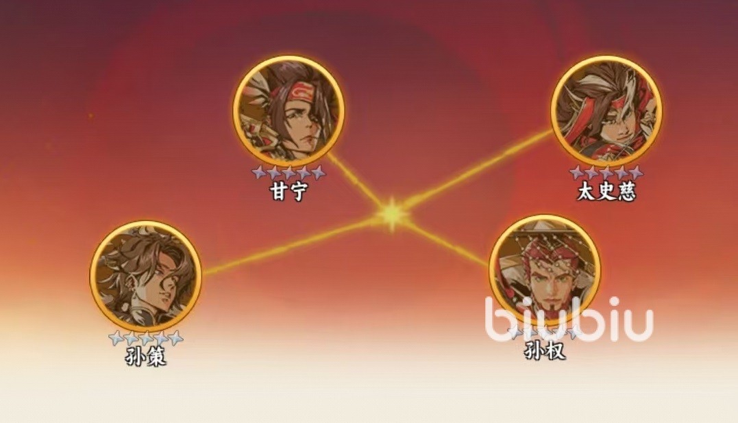 在阵容搭配的时候,孙权最应该选择的队友就是激活制霸江东的三人,分别是孙策,甘宁,太史慈,这四名武将一起出战提升属性,在战斗前两回合暴击率提高,孙策首次行动可触发小霸王。每回合开始时,四人各获得一层制霸,有增伤和减伤的属性加成,全方位提升所有武将的效果。另外一个关东诸侯也尽量触发,上阵的三个人是曹操、刘备和袁绍。战斗开始时对全体友方附加同辉,伤害提升,只要曹操存活,每回合就可以给敌方施加压制,降低其被治疗效果。
