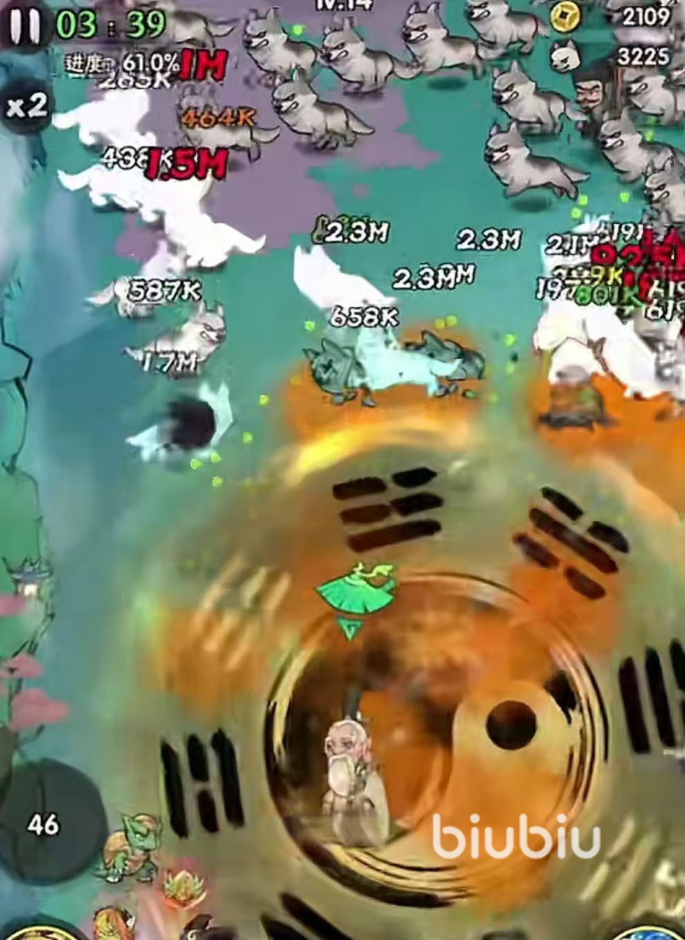 最后看到的是张三丰,他会以自身为中心啊释放一个持续三秒的八卦阵,这个3秒8卦阵,我觉得是相当的顶啊。它这个范围也是非常的大,然后它这个小罐子会造成一个持续伤害,只要他八卦阵在,他就会对小怪造成伤害,应该是一秒造成一次.