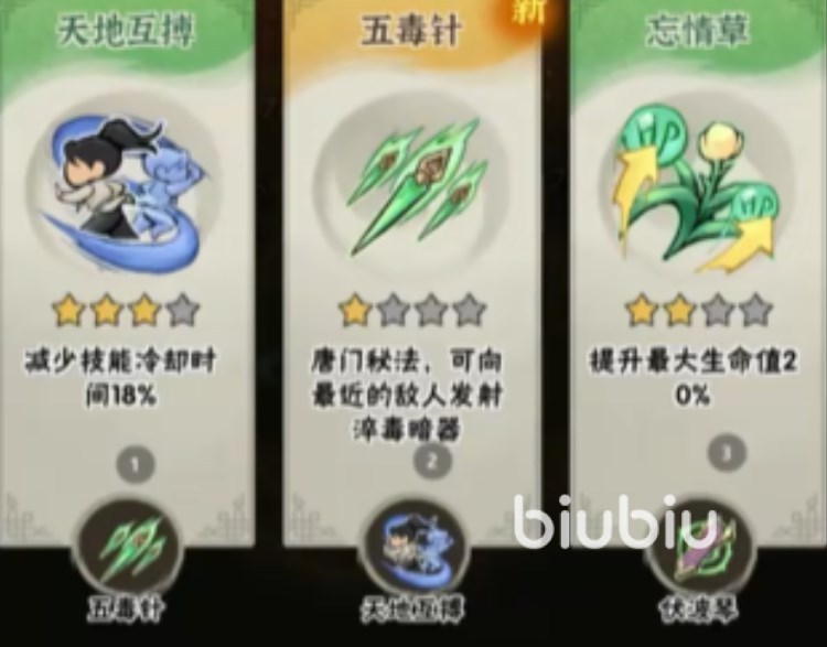 第三个法宝就是:阴阳鱼,对应法宝为落叶镖,碰撞敌人后会追踪并转化为大树造成伤害,这个法宝的视觉效果很好,伤害也不错,尤其是在打妖王时,效果非常得好。第四法宝就是:孔雀翎,对应法宝为五毒针,其追踪效果一般可以在前期一定程度上增加清兵概率。
