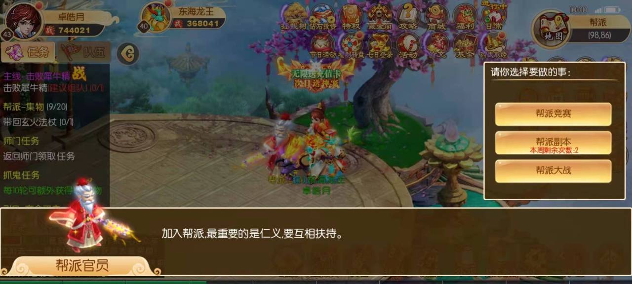 1.帮派竞赛:在每周二、四、六的21点准时开始,21点半准时结束,游玩方法就是坐骑式赛马,按照规定参与活动,在结束后就能获经脉丹奖励。