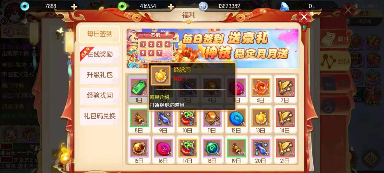 4.每日签到:每天登入游戏,并进行签到,在签到页面就可以查看详细奖励,里面是有经脉丹的。