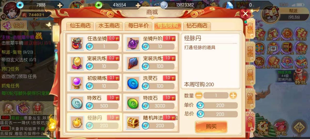 2.每周限购:在商城中有一个每周限购,玩家可以通过使用仙玉进行购买,经脉丹的单价一颗是200仙玉,一周限量200颗,200颗买完就得等下周的零点刷新了。