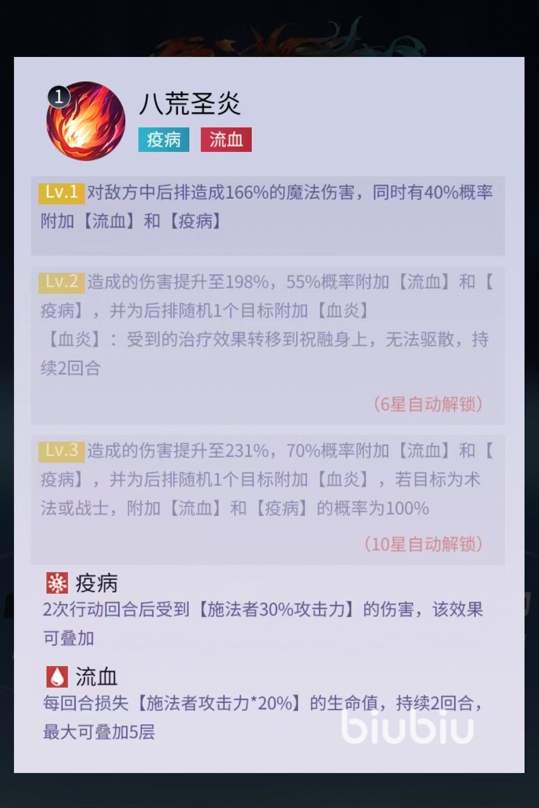如果面对的是比较强的敌人,那么祝融也不会虚,他的技能八荒圣炎除了造成伤害提升之外,升级之后附加的流血和疫病的概率同样会提升。同时还能随机给一个后排目标添加上一个血炎效果,该效果如果是法系或者是战士,会使其附加流血和疾病的死亡率提升到100%。自身独特的技能效果,所以在挑选队友的时候一定要慎重,尽量是其他的队友也都需要,异常状态以及可以引爆异常状态等特殊的效果。