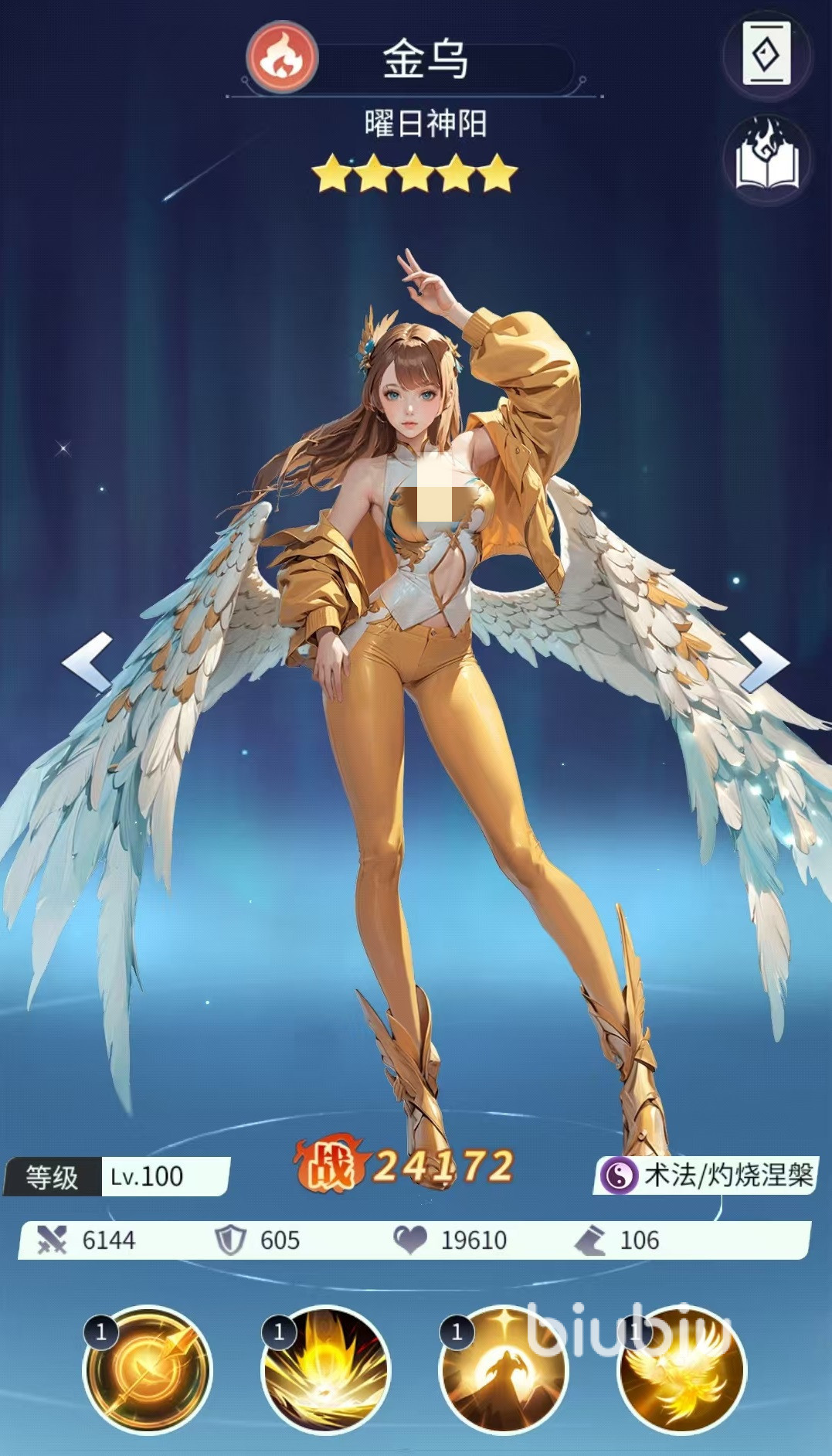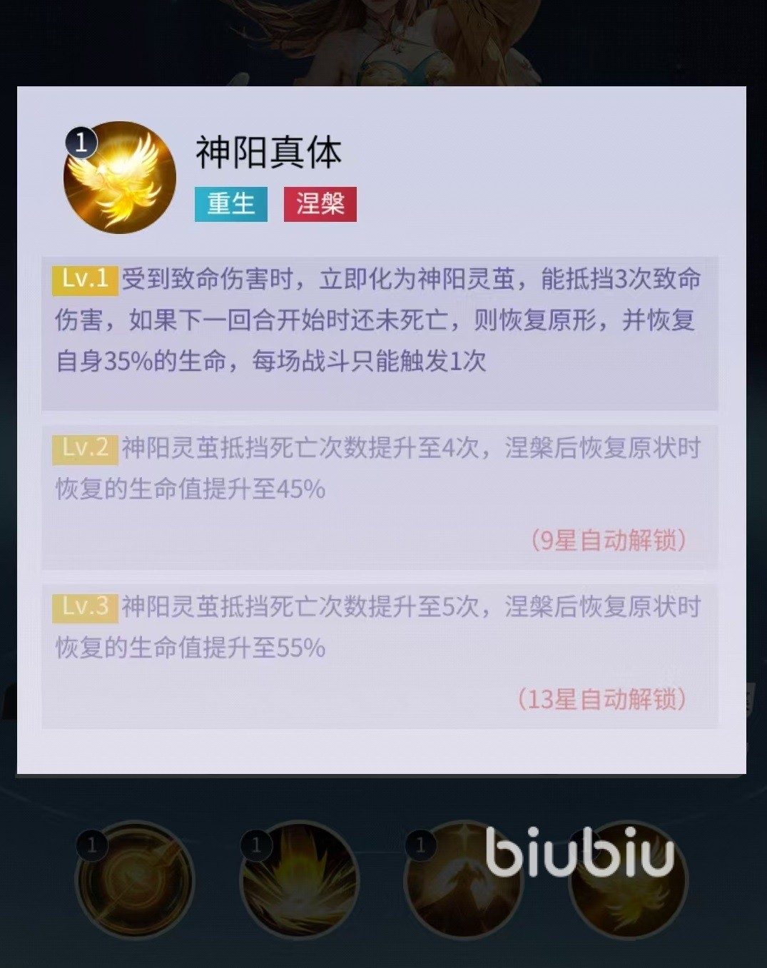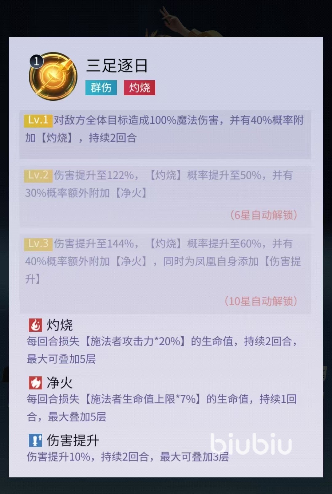 因为不是同名效果,所以这两个异常状态可以同时生效,这样叠加起来会令对方非常难受。自身的普攻也有几率附加灼烧,且优先瞄准带灼烧的目标。还有一个被动效果是当金乌受到致命伤害时会立即化茧,可抵挡三次致命伤害,如果下一回合开始时依然没有死亡,就可以恢复原型并恢复少量生命值。这样就相当于金乌多了一条命,这对于保命来说非常关键。所以自身即使在后排面被对方直接针对,也可以凭借被动爬起来再次进行输出。