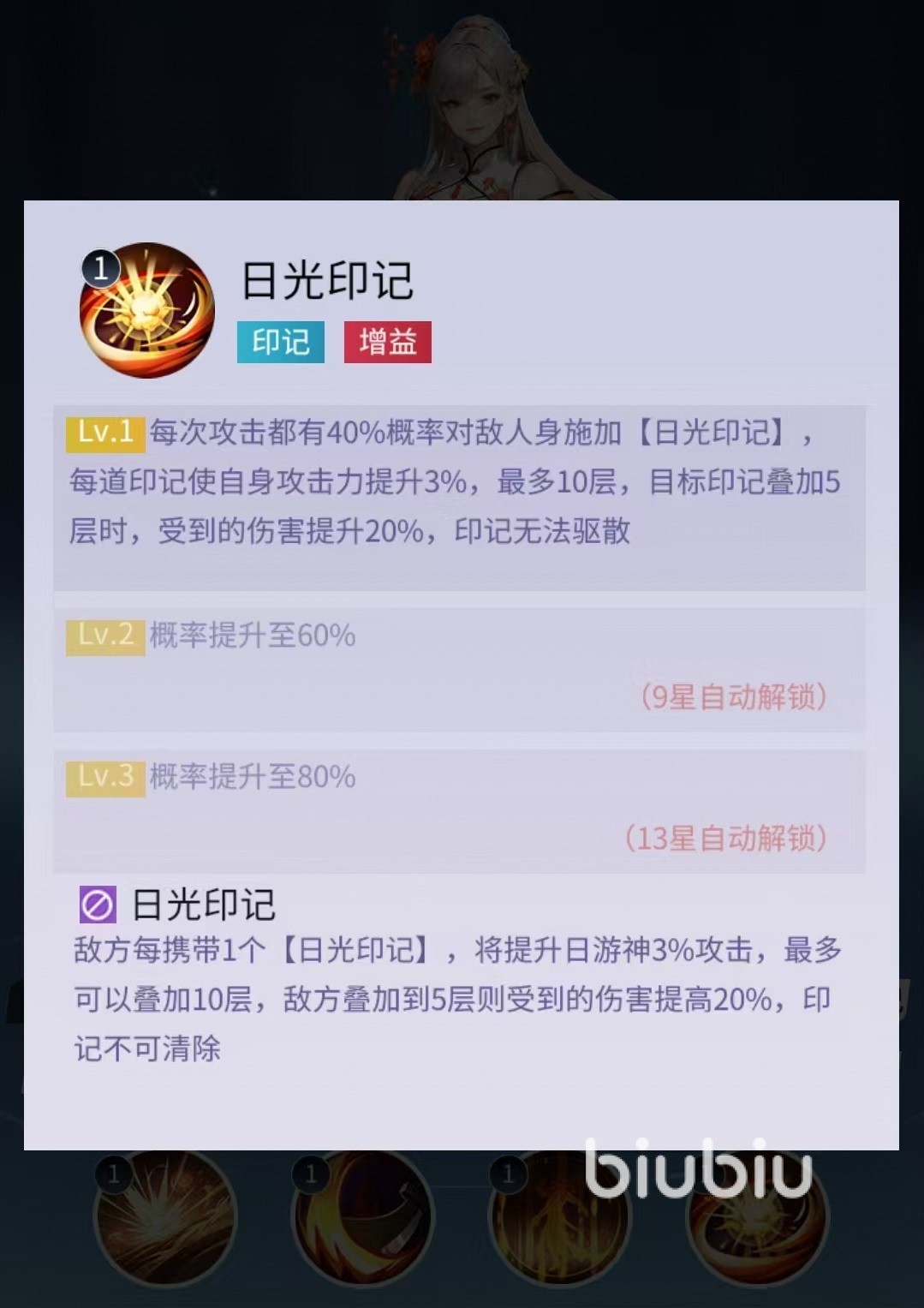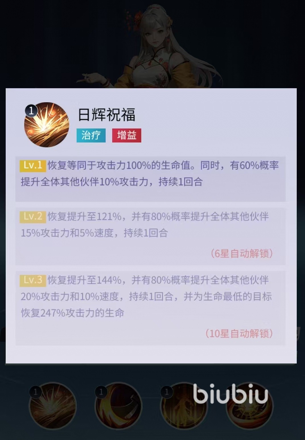 第二个技能属于自身的普攻,可随机伤害三个目标,比较中庸的技能。被动也是提升攻击力、生命值和治疗效果。大招在每次攻击时,都有几率给敌人身上施加日光印记,每到印记可以增加自身3%攻击力,最多叠加10层。目标身上的印记叠加5层时,受到的伤害提升20%。这个技能效果提升自身攻击力也就增加了治疗的能力,提高对方受到的伤害,也就辅助我方更好的输出,所以这个治疗在战斗方面还是比较全面的。