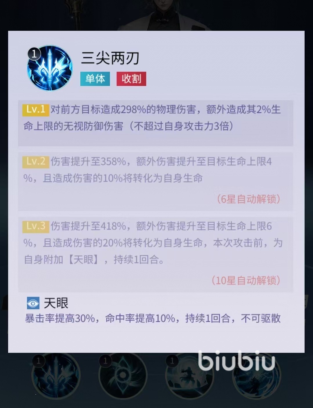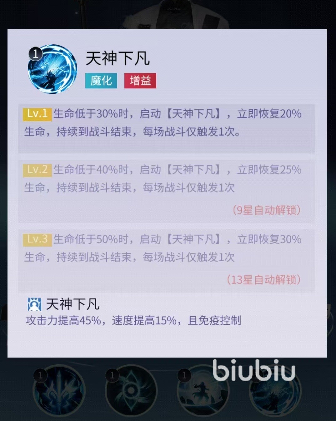 杨戬的二技能在每次进行普攻的时候提升伤害系数,本身其他英雄释放控制类技能时,发动一次追击。技能主要提升的是攻击力、生命和暴击率这三样主属性。最后一个天神下凡,在杨戬血量低于30%的时候会启动天神下凡,立即恢复大量生命值,每场战斗只能触发一次。在天神状态下还可以大幅度提升攻击力、速度和免疫控制能力,所以说此状态下面的杨戬可真正是做到无视任何人。当面对控制比较多的时候,可以直接将杨戬拿出来作为核心主c,这样无视控制状态下就可以快速消灭敌人。