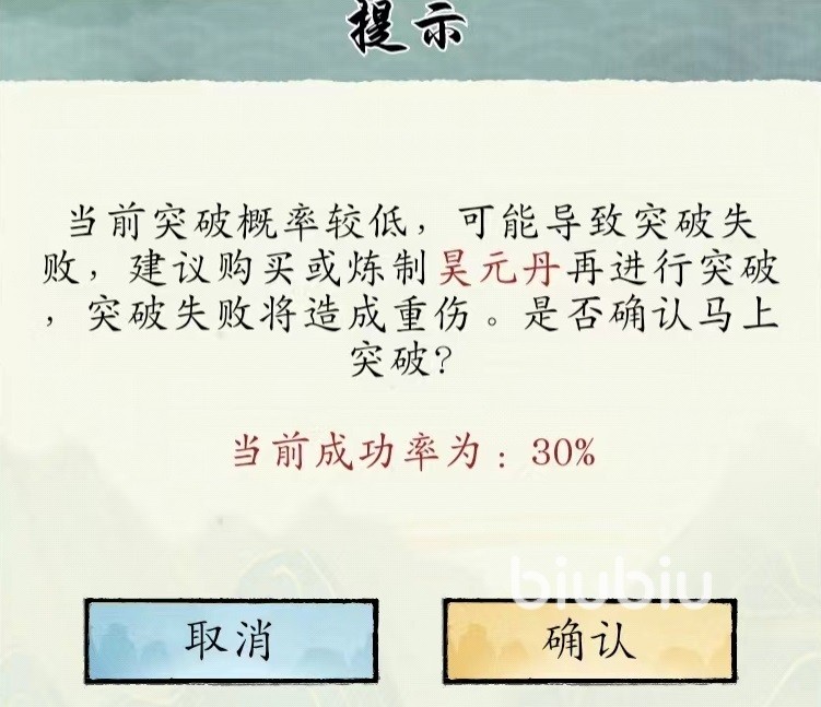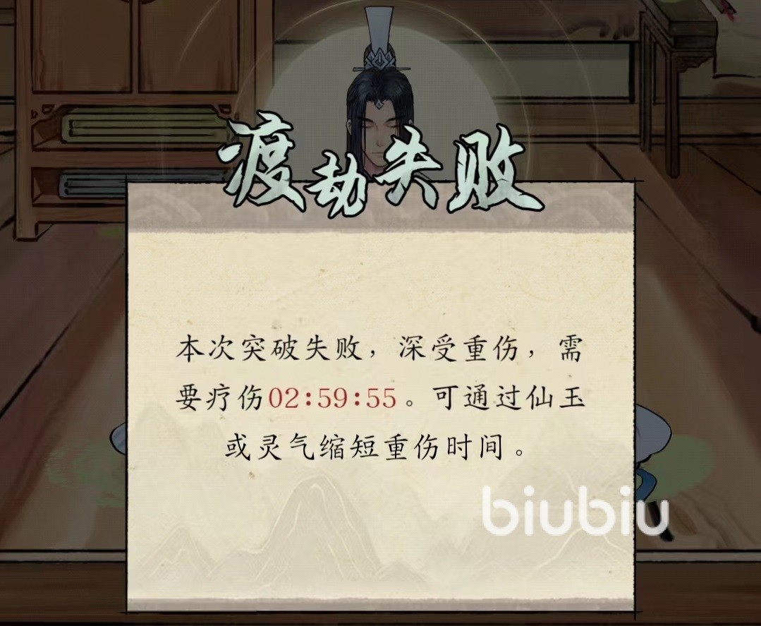当玩家积累够足够多修为值,在洞府中进行突破时候可以看到有当前境界突破成功率这一点。如果成功率达到80%以上,那么基本上能保证成功,如果更低些就需要注意,此时就有很大几率直接失败。一旦失败之后就会进入到重伤状态。此时需要消耗大量时间进行养伤,如果不想等待,所采取方式主要有以下两种。一种是消耗仙玉来减少时间,另一种是消耗灵气。