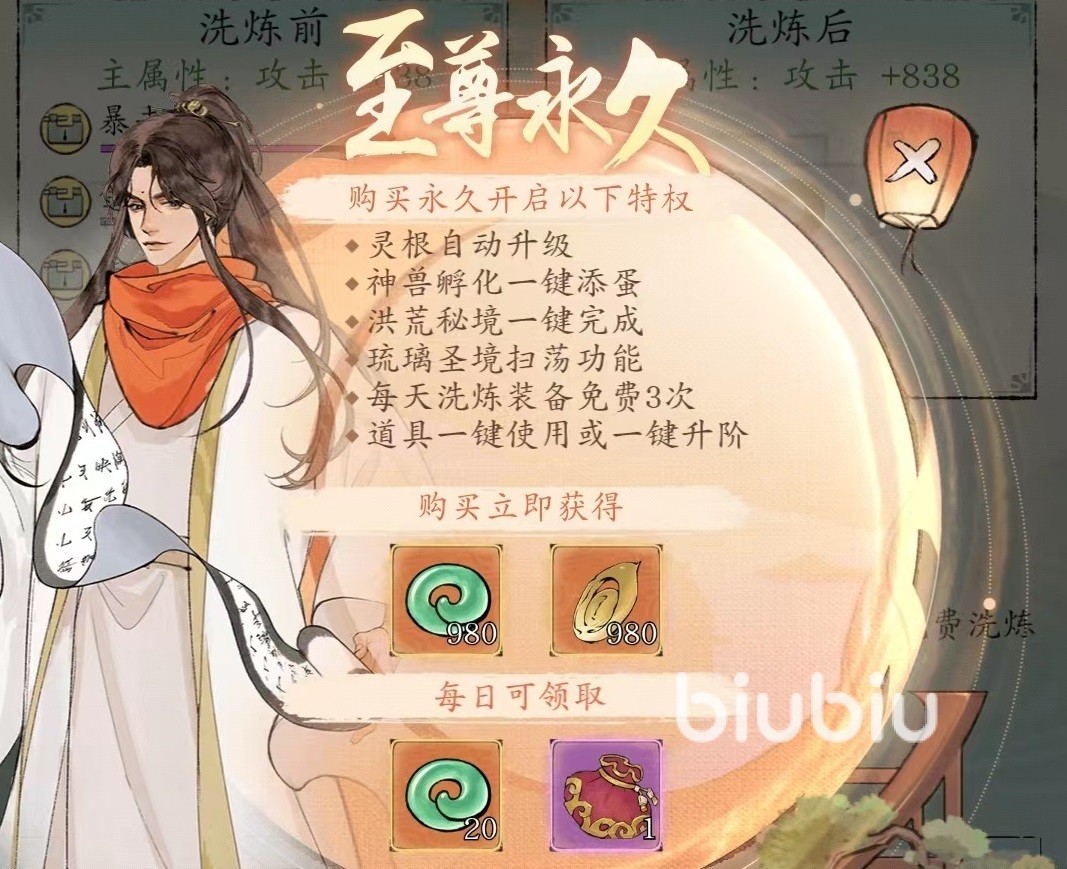 洗练要消耗的道具是洗练石,可以在论道坊市、寻宝活动和琉璃圣境等多项途径中获取。最终洗练结果有保底机制,即使脸非常黑也不用担心出现很离谱结果,例如在结丹期装备保底会出现两条,随着境界提升保底数量也会增加。最后还向大家介绍一个比较有用的设定,就是在开启至尊永久功能后,每天可以获得三次免费洗练次数,建议大家不要浪费,即使不需要也可以拿来先洗一下,感觉不满意直接不保存就是。